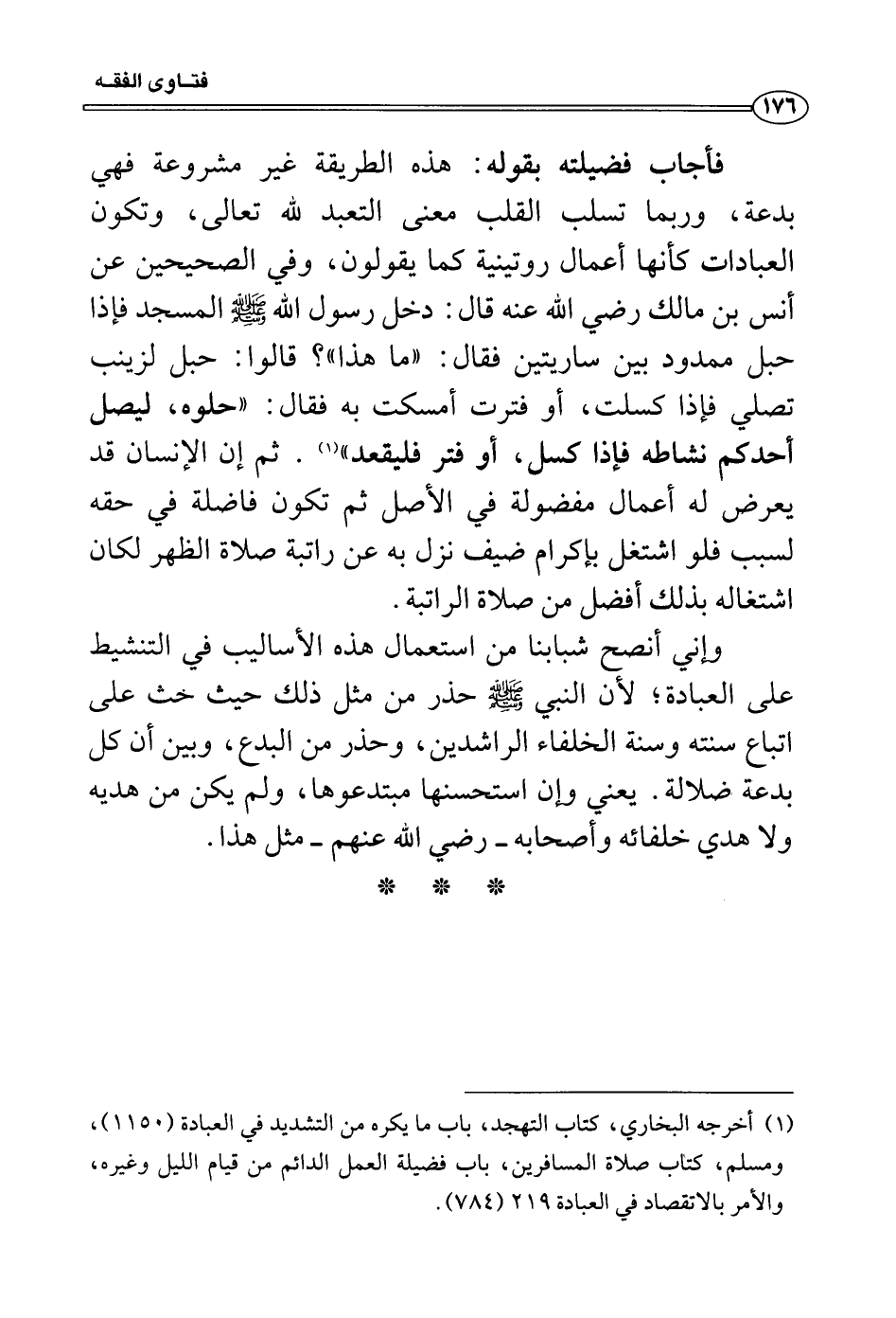 فأجاب فضيلته بقوله: هذه الطريقة غير مشروعة فهي بدعة، وربما تسلب القلب معنى التعبد لله تعالى، وتكون العبادات كأنها أعمال روتينية كما يقولون، وفي الصحيحين عن أنس بن مالك رضي الله عنه قال: دخل رسول الله صَلَّى اللَّهُ عَلَيْهِ وَسَلَّمَ المسجد فإذا حبل ممدود بين ساريتين فقال: «ما هذا» ؟ قالوا: حبل لزينب تصلي فإذا كسلت، أو فترت أمسكت به فقال: «حلوه، ليصل أحدكم نشاطه فإذا كسل، أو فتر فليقعد» . ثم إن الإنسان قد يعرض له أعمال مفضولة في الأصل ثم تكون فاضلة في حقه لسبب فلو اشتغل بإكرام ضيف نزل به عن راتبة صلاة الظهر لكان اشتغاله بذلك أفضل من صلاة الراتبة.