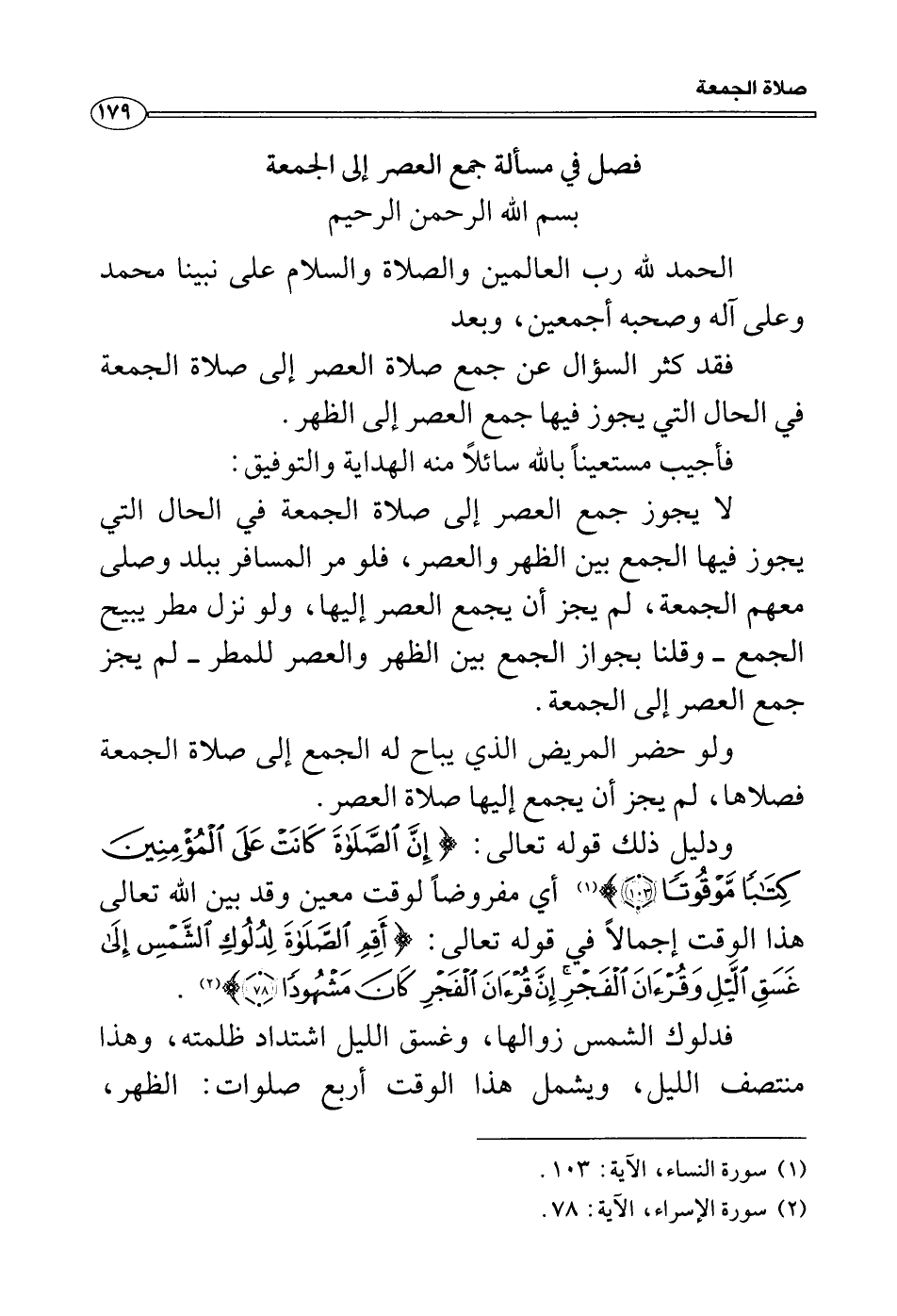 ودليل ذلك قوله تعالى: {إِنَّ الصلاةَ كَانَتْ عَلَى الْمُؤْمِنِينَ كِتَاباً مَّوْقُوتاً} أي مفروضاً لوقت معين وقد بين الله تعالى هذا الوقت إجمالاً في قوله تعالى: {أَقِمِ الصلاةَ لِدُلُوكِ الشَّمْسِ إِلَى غَسَقِ الَّيْلِ وَقُرْءَانَ الْفَجْرِ إِنَّ قُرْءَانَ الْفَجْرِ كَانَ مَشْهُودًا} .