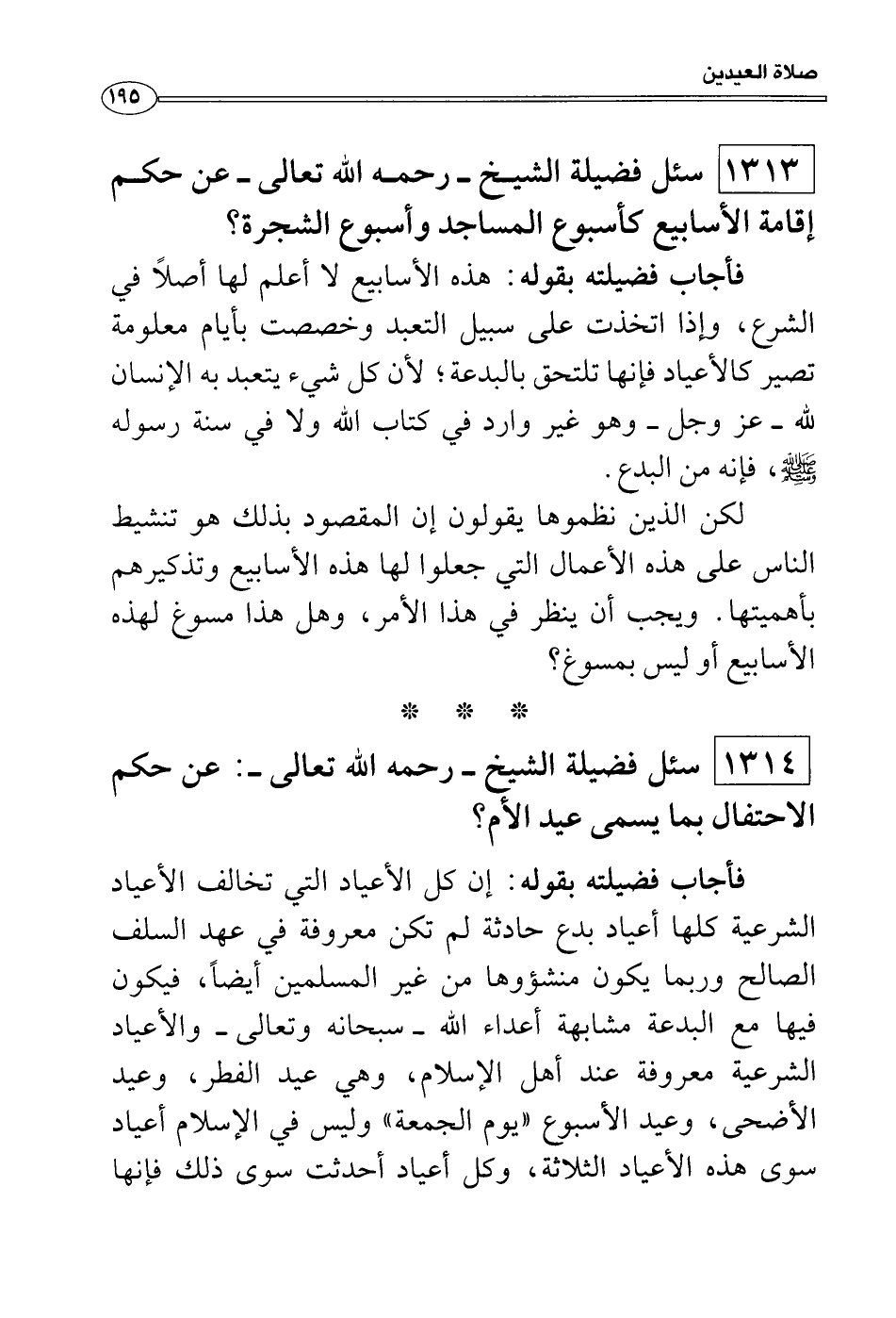 فأجاب فضيلته بقوله: إن كل الأعياد التي تخالف الأعياد الشرعية كلها أعياد بدع حادثة لم تكن معروفة في عهد السلف الصالح وربما يكون منشؤوها من غير المسلمين أيضاً، فيكون فيها مع البدعة مشابهة أعداء الله سبحانه وتعالى والأعياد الشرعية معروفة عند أهل الإسلام، وهي عيد الفطر، وعيد الأضحى، وعيد الأسبوع «يوم الجمعة» وليس في الإسلام أعياد سوى هذه الأعياد الثلاثة، وكل أعياد أحدثت سوى ذلك فإنها