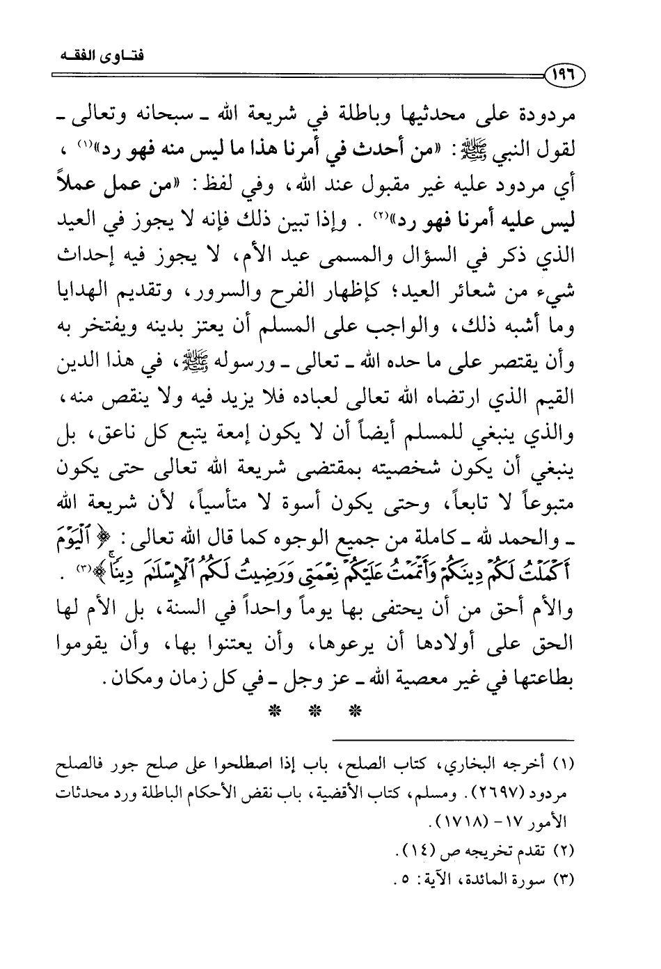 مردودة على محدثيها وباطلة في شريعة الله سبحانه وتعالى لقول النبي صَلَّى اللَّهُ عَلَيْهِ وَسَلَّمَ: «من أحدث في أمرنا هذا ما ليس منه فهو رد» ، أي مردود عليه غير مقبول عند الله، وفي لفظ: «من عمل عملاً ليس عليه أمرنا فهو رد» . وإذا تبين ذلك فإنه لا يجوز في العيد الذي ذكر في السؤال والمسمى عيد الأم، لا يجوز فيه إحداث شيء من شعائر العيد؛ كإظهار الفرح والسرور، وتقديم الهدايا وما أشبه ذلك، والواجب على المسلم أن يعتز بدينه ويفتخر به وأن يقتصر على ما حده الله تعالى ورسوله صَلَّى اللَّهُ عَلَيْهِ وَسَلَّمَ، في هذا الدين القيم الذي ارتضاه الله تعالى لعباده فلا يزيد فيه ولا ينقص منه، والذي ينبغي للمسلم أيضاً أن لا يكون إمعة يتبع كل ناعق، بل ينبغي أن يكون شخصيته بمقتضى شريعة الله تعالى حتى يكون متبوعاً لا تابعاً، وحتى يكون أسوة لا متأسياً، لأن شريعة الله والحمد لله كاملة من جميع الوجوه كما قال الله تعالى: {الْيَوْمَ أَكْمَلْتُ لَكُمْ دِينَكُمْ وَأَتْمَمْتُ عَلَيْكُمْ نِعْمَتِى وَرَضِيتُ لَكُمُ الأِسْلاَمَ دِيناً فَمَنِ اضْطُرَّ فِى مَخْمَصَةٍ غَيْرَ مُتَجَانِفٍ لإِثْمٍ فَإِنَّ اللهَ غَفُورٌ رَّحِيمٌ دِيناً فَمَنِ اضْطُرَّ فِى مَخْمَصَةٍ غَيْرَ مُتَجَانِفٍ لإِثْمٍ فَإِنَّ اللهَ غَفُورٌ رَّحِيمٌ} . والأم أحق من أن يحتفى بها يوماً واحداً في السنة، بل الأم لها الحق على أولادها أن يرعوها، وأن يعتنوا بها، وأن يقوموا بطاعتها في غير معصية الله عز وجل في كل زمان ومكان.