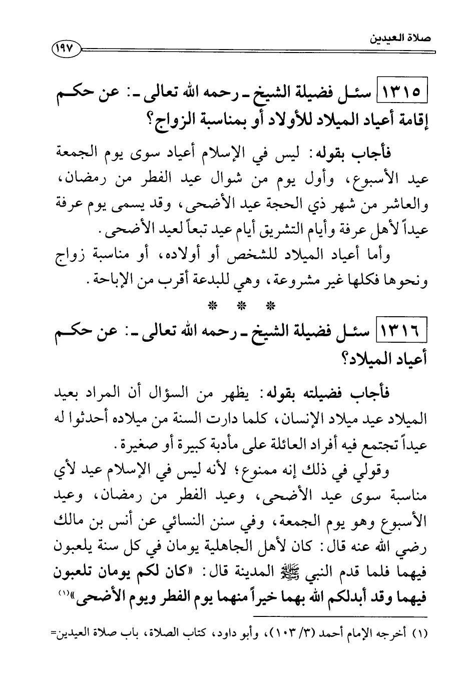 فأجاب بقوله: ليس في الإسلام أعياد سوى يوم الجمعة عيد الأسبوع، وأول يوم من شوال عيد الفطر من رمضان، والعاشر من شهر ذي الحجة عيد الأضحى، وقد يسمى يوم عرفة عيداً لأهل عرفة وأيام التشريق أيام عيد تبعاً لعيد الأضحى.