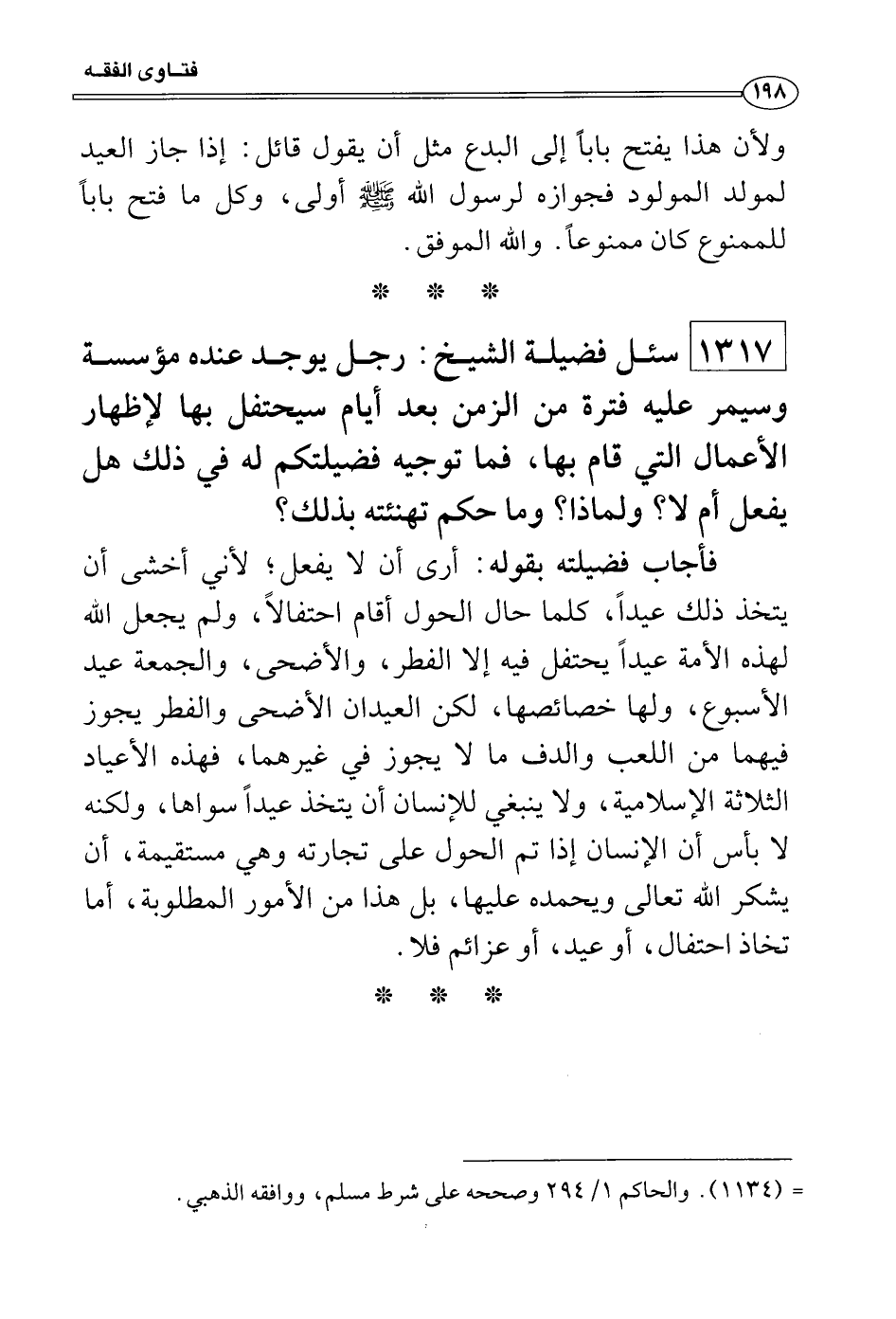 فأجاب فضيلته بقوله: أرى أن لا يفعل؛ لأني أخشى أن يتخذ ذلك عيداً، كلما حال الحول أقام احتفالاً، ولم يجعل الله لهذه الأمة عيداً يحتفل فيه إلا الفطر، والأضحى، والجمعة عيد الأسبوع، ولها خصائصها، لكن العيدان الأضحى والفطر يجوز فيهما من اللعب والدف ما لا يجوز في غيرهما، فهذه الأعياد الثلاثة الإسلامية، ولا ينبغي للإنسان أن يتخذ عيداً سواها، ولكنه لا بأس أن الإنسان إذا تم الحول على تجارته وهي مستقيمة، أن يشكر الله تعالى ويحمده عليها، بل هذا من الأمور المطلوبة، أما تخاذ احتفال، أو عيد، أو عزائم فلا.