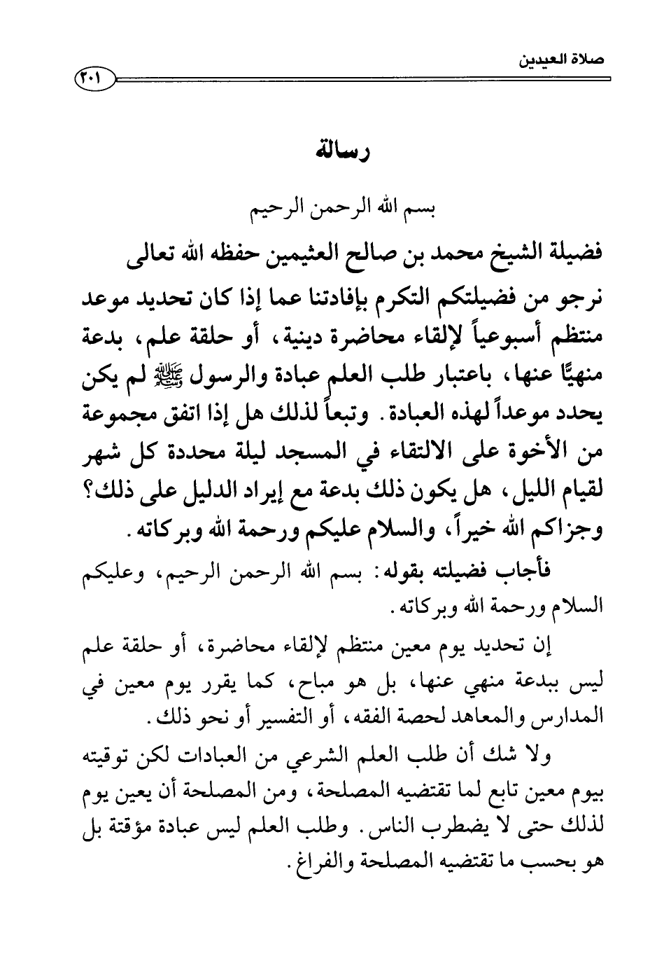 إن تحديد يوم معين منتظم لإلقاء محاضرة، أو حلقة علم ليس ببدعة منهي عنها، بل هو مباح، كما يقرر يوم معين في المدارس والمعاهد لحصة الفقه، أو التفسير أو نحو ذلك.