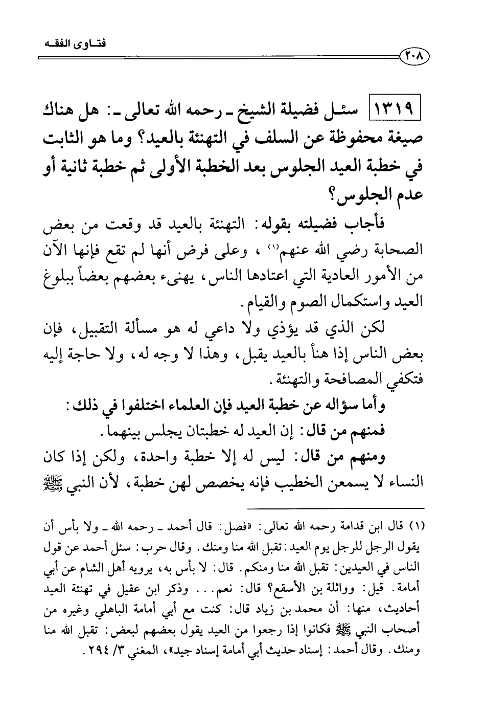 سئل فضيلة الشيخ - رحمه الله تعالى -: هل هناك صيغة محفوظة عن السلف في التهنئة بالعيد؟ وما هو الثابت في خطبة العيد الجلوس بعد الخطبة الأولى ثم خطبة ثانية أو عدم الجلوس؟