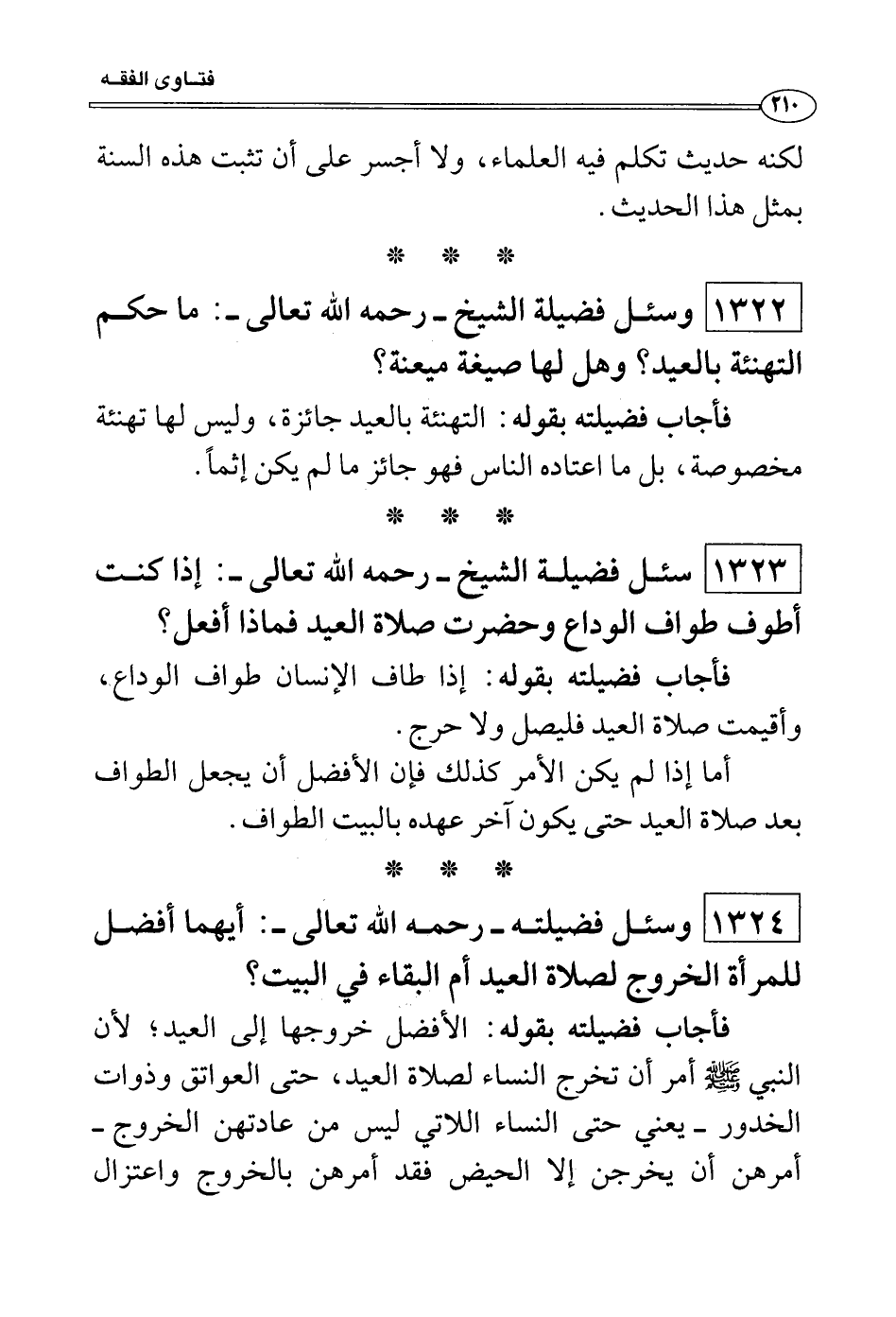 وسئل فضيلته - رحمه الله تعالى -: أيهما أفضل للمرأة الخروج لصلاة العيد أم البقاء في البيت؟