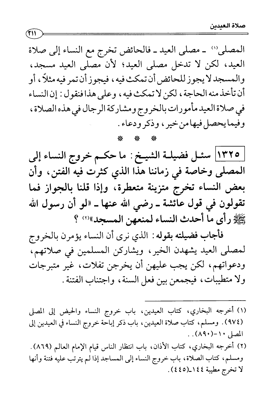 فأجاب فضيلته بقوله: الذي نرى أن النساء يؤمرن بالخروج لمصلى العيد يشهدن الخير، ويشاركن المسلمين في صلاتهم، ودعواتهم، لكن يجب عليهن أن يخرجن تفلات، غير متبرجات ولا متطيبات، فيجمعن بين فعل السنة، واجتناب الفتنة.