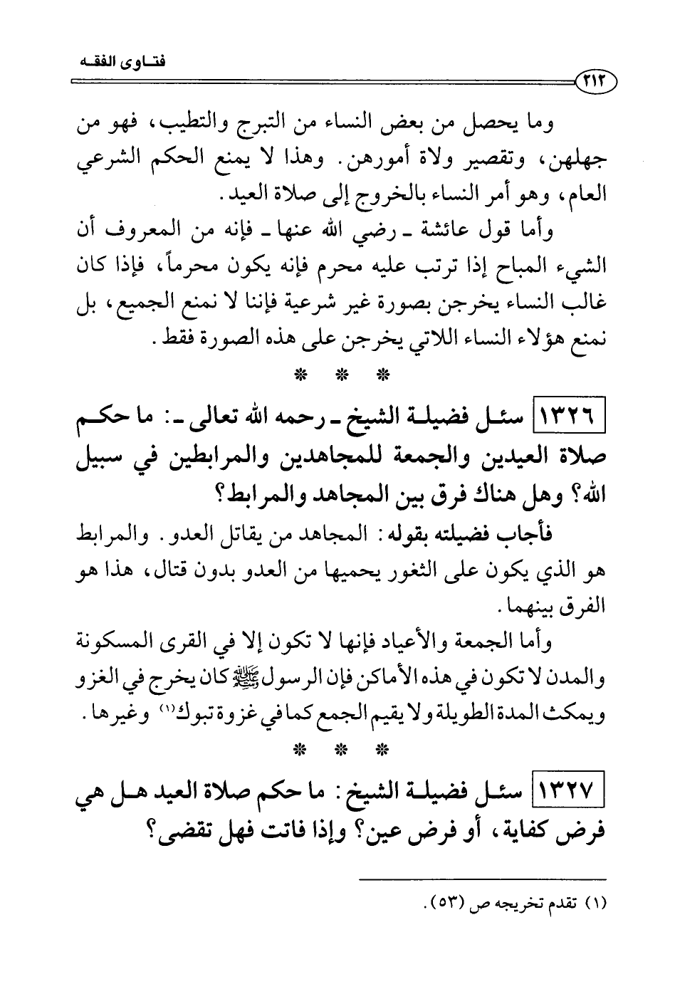 سئل فضيلة الشيخ - رحمه الله تعالى -: ما حكم صلاة العيدين والجمعة للمجاهدين والمرابطين في سبيل الله؟ وهل هناك فرق بين المجاهد والمرابط؟