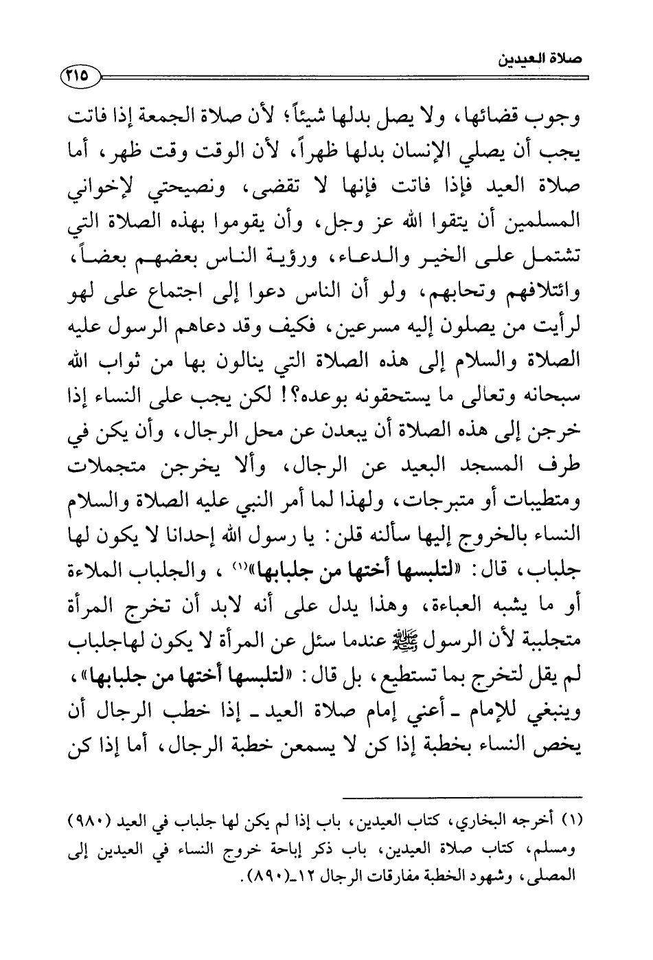 وجوب قضائها، ولا يصل بدلها شيئاً؛ لأن صلاة الجمعة إذا فاتت يجب أن يصلي الإنسان بدلها ظهراً، لأن الوقت وقت ظهر، أما صلاة العيد فإذا فاتت فإنها لا تقضى، ونصيحتي لإخواني المسلمين أن يتقوا الله عز وجل، وأن يقوموا بهذه الصلاة التي تشتمل على الخير والدعاء، ورؤية الناس بعضهم بعضاً، وائتلافهم وتحابهم، ولو أن الناس دعوا إلى اجتماع على لهو لرأيت من يصلون إليه مسرعين، فكيف وقد دعاهم الرسول عليه الصلاة والسلام إلى هذه الصلاة التي ينالون بها من ثواب الله سبحانه وتعالى ما يستحقونه بوعده؟! لكن يجب على النساء إذا خرجن إلى هذه الصلاة أن يبعدن عن محل الرجال، وأن يكن في طرف المسجد البعيد عن الرجال، وألا يخرجن متجملات ومتطيبات أو متبرجات، ولهذا لما أمر النبي عليه الصلاة والسلام النساء بالخروج إليها سألنه قلن: يا رسول الله إحدانا لا يكون لها جلباب، قال: «لتلبسها أختها من جلبابها» ، والجلباب الملاءة أو ما يشبه العباءة، وهذا يدل على أنه لابد أن تخرج المرأة متجلببة لأن الرسول صَلَّى اللَّهُ عَلَيْهِ وَسَلَّمَ عندما سئل عن المرأة لا يكون لهاجلباب لم يقل لتخرج بما تستطيع، بل قال: «لتلبسها أختها من جلبابها» ، وينبغي للإمام أعني إمام صلاة العيد إذا خطب الرجال أن يخص النساء بخطبة إذا كن لا يسمعن خطبة الرجال، أما إذا كن