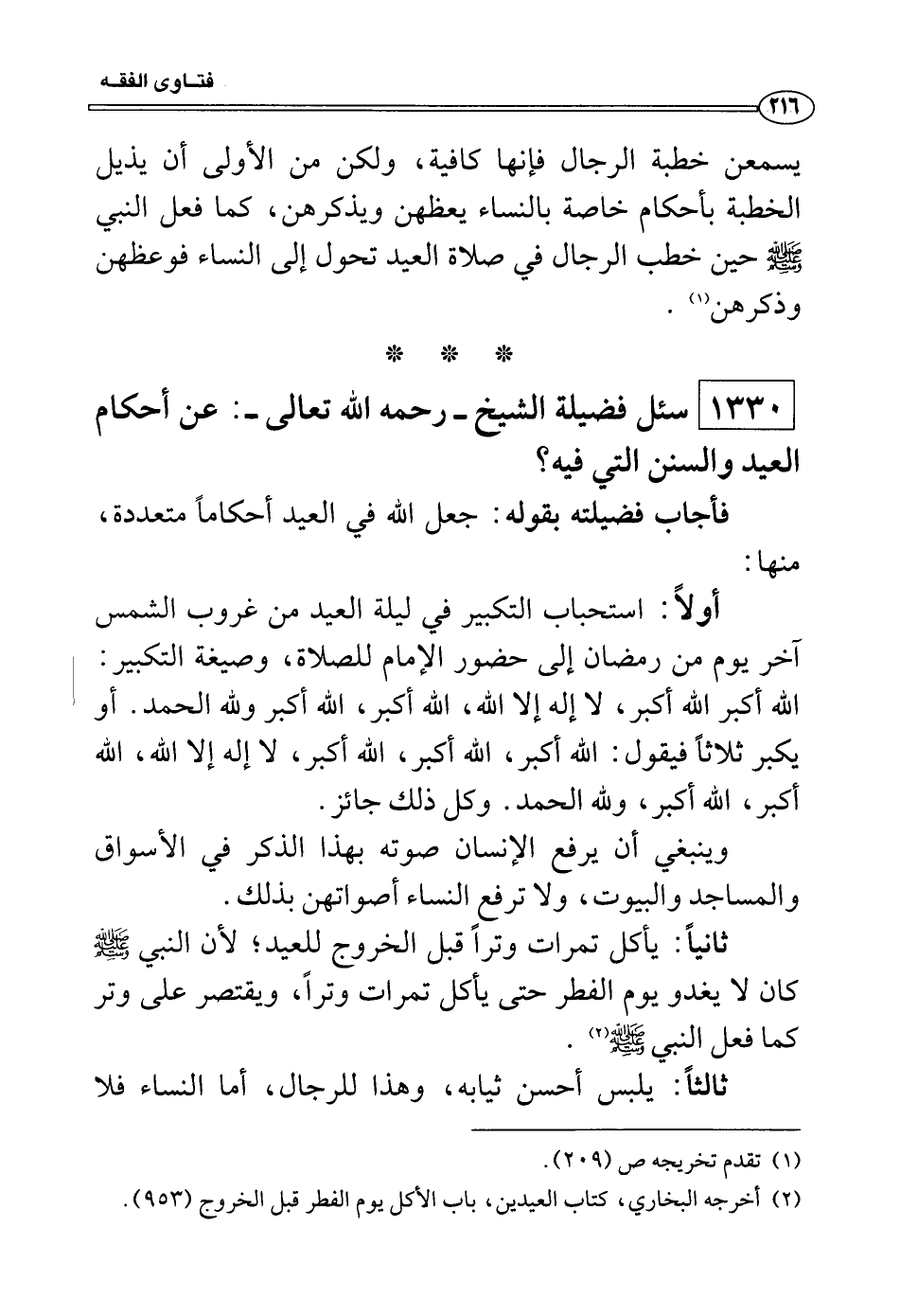 سئل فضيلة الشيخ - رحمه الله تعالى -: عن أحكام العيد والسنن التي فيه؟