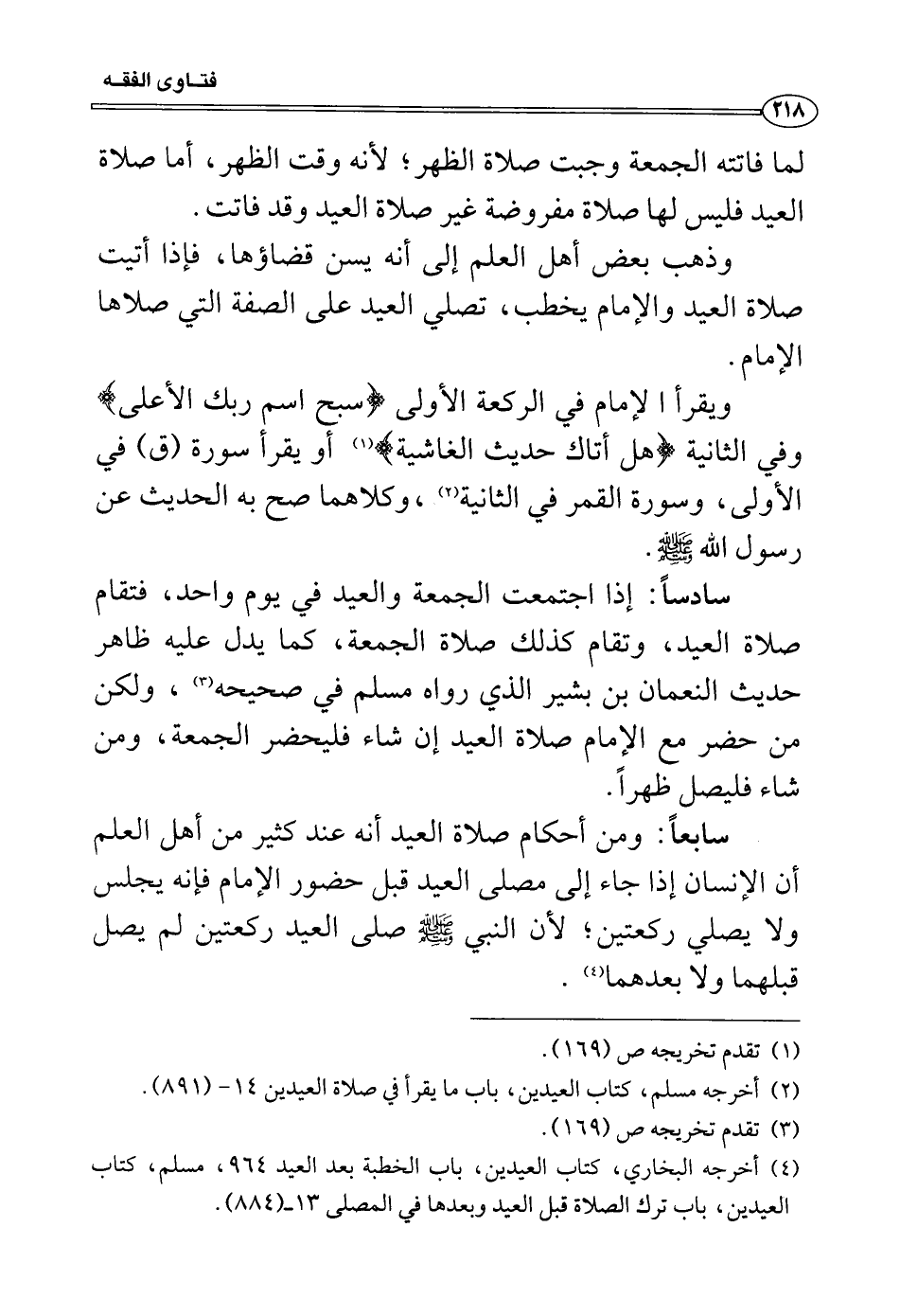 سادساً: إذا اجتمعت الجمعة والعيد في يوم واحد، فتقام صلاة العيد، وتقام كذلك صلاة الجمعة، كما يدل عليه ظاهر حديث النعمان بن بشير الذي رواه مسلم في صحيحه، ولكن من حضر مع الإمام صلاة العيد إن شاء فليحضر الجمعة، ومن شاء فليصل ظهراً.