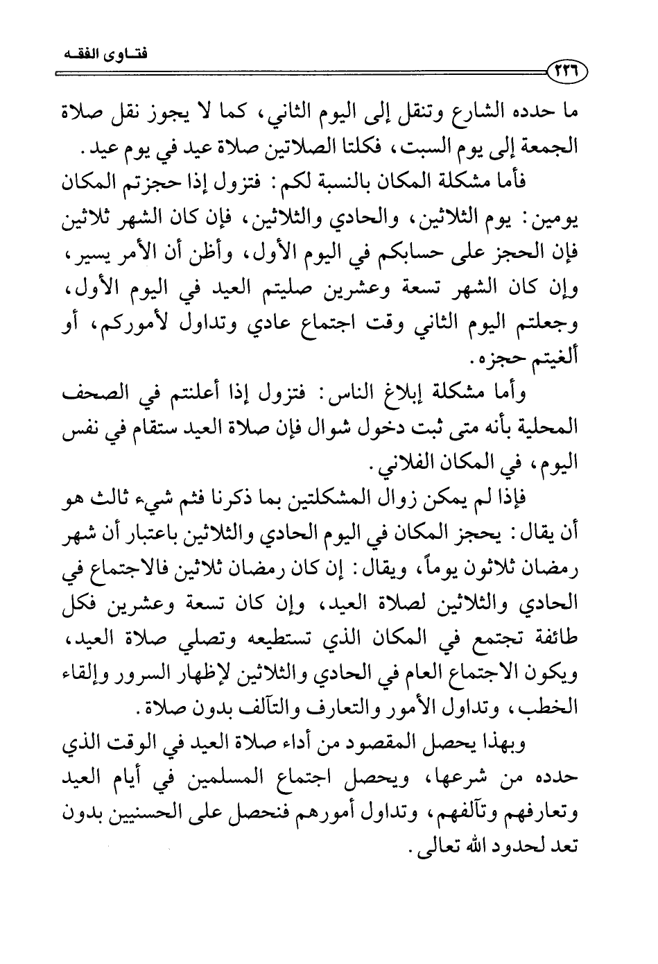 وبهذا يحصل المقصود من أداء صلاة العيد في الوقت الذي حدده من شرعها، ويحصل اجتماع المسلمين في أيام العيد وتعارفهم وتآلفهم، وتداول أمورهم فنحصل على الحسنيين بدون تعد لحدود الله تعالى.