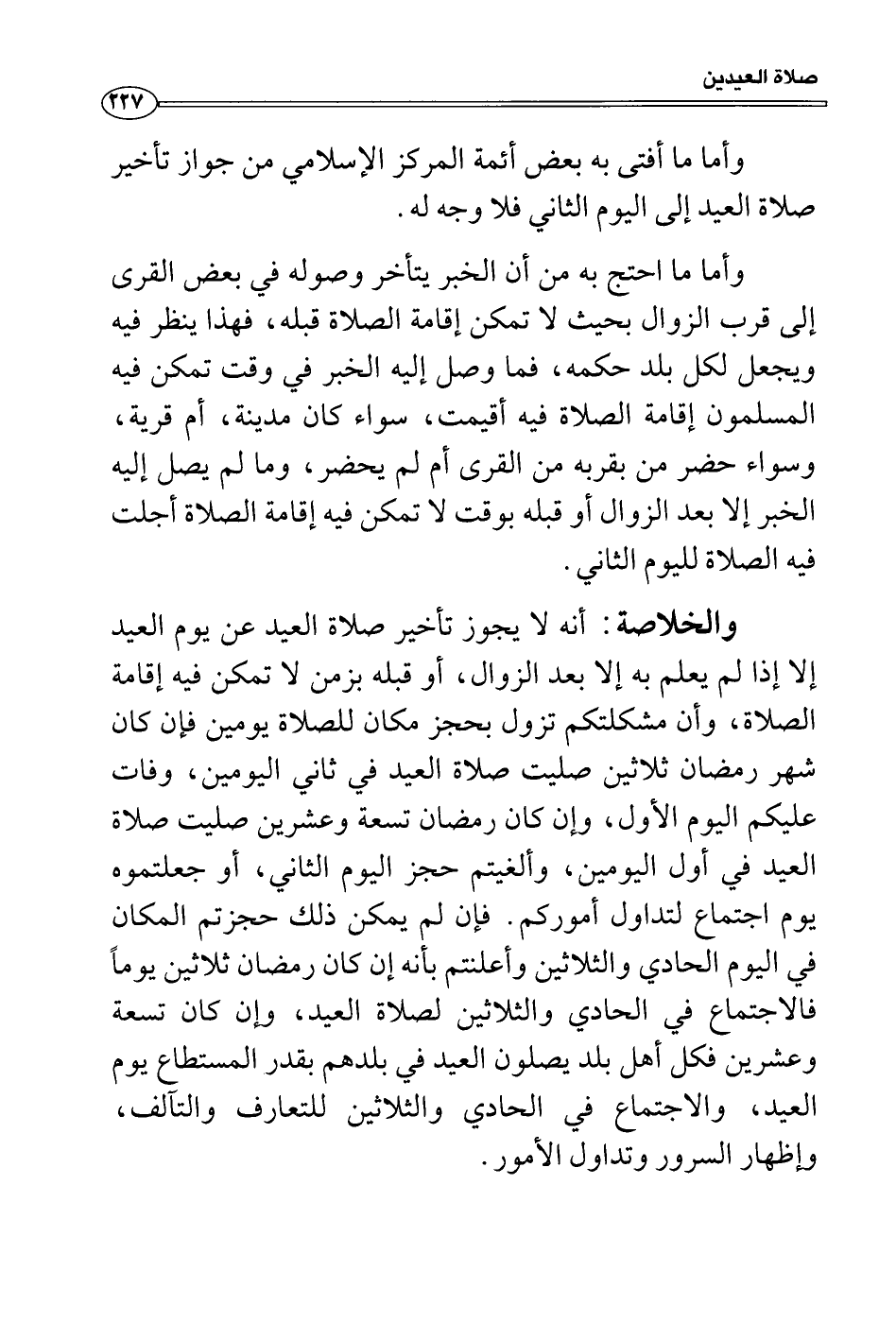 وأما ما أفتى به بعض أئمة المركز الإسلامي من جواز تأخير صلاة العيد إلى اليوم الثاني فلا وجه له.