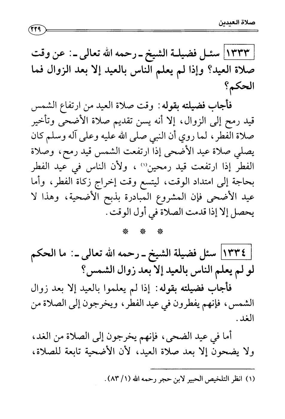 فأجاب فضيلته بقوله: وقت صلاة العيد من ارتفاع الشمس قيد رمح إلى الزوال، إلا أنه يسن تقديم صلاة الأضحى وتأخير صلاة الفطر، لما روي أن النبي صلى الله عليه وعلى آله وسلم كان يصلي صلاة عيد الأضحى إذا ارتفعت الشمس قيد رمح، وصلاة الفطر إذا ارتفعت قيد رمحين، ولأن الناس في عيد الفطر بحاجة إلى امتداد الوقت، ليتسع وقت إخراج زكاة الفطر، وأما عيد الأضحى فإن المشروع المبادرة بذبح الأضحية، وهذا لا يحصل إلا إذا قدمت الصلاة في أول الوقت.