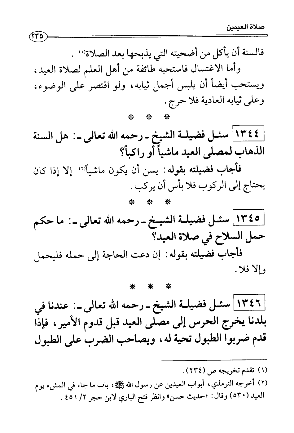 سئل فضيلة الشيخ - رحمه الله تعالى -: ما حكم حمل السلاح في صلاة العيد؟