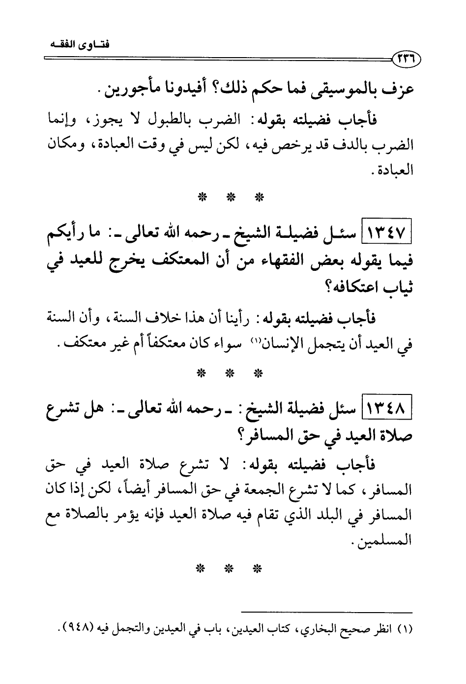 فأجاب فضيلته بقوله: لا تشرع صلاة العيد في حق المسافر، كما لا تشرع الجمعة في حق المسافر أيضاً، لكن إذا كان المسافر في البلد الذي تقام فيه صلاة العيد فإنه يؤمر بالصلاة مع المسلمين.