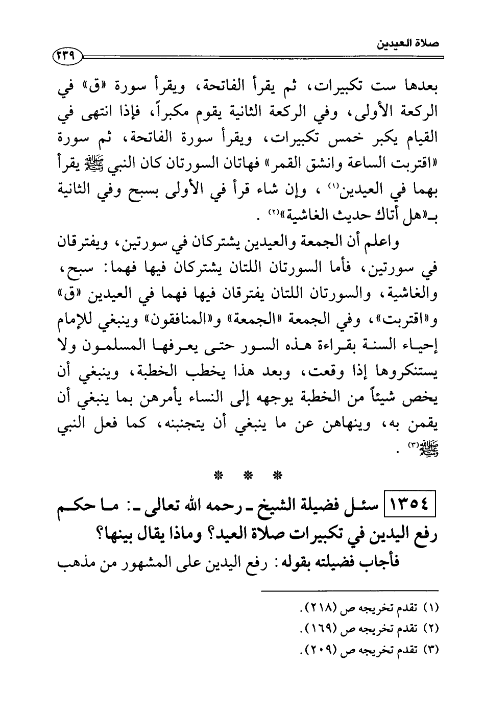 سئل فضيلة الشيخ - رحمه الله تعالى -: ما حكم رفع اليدين في تكبيرات صلاة العيد؟ وماذا يقال بينها؟