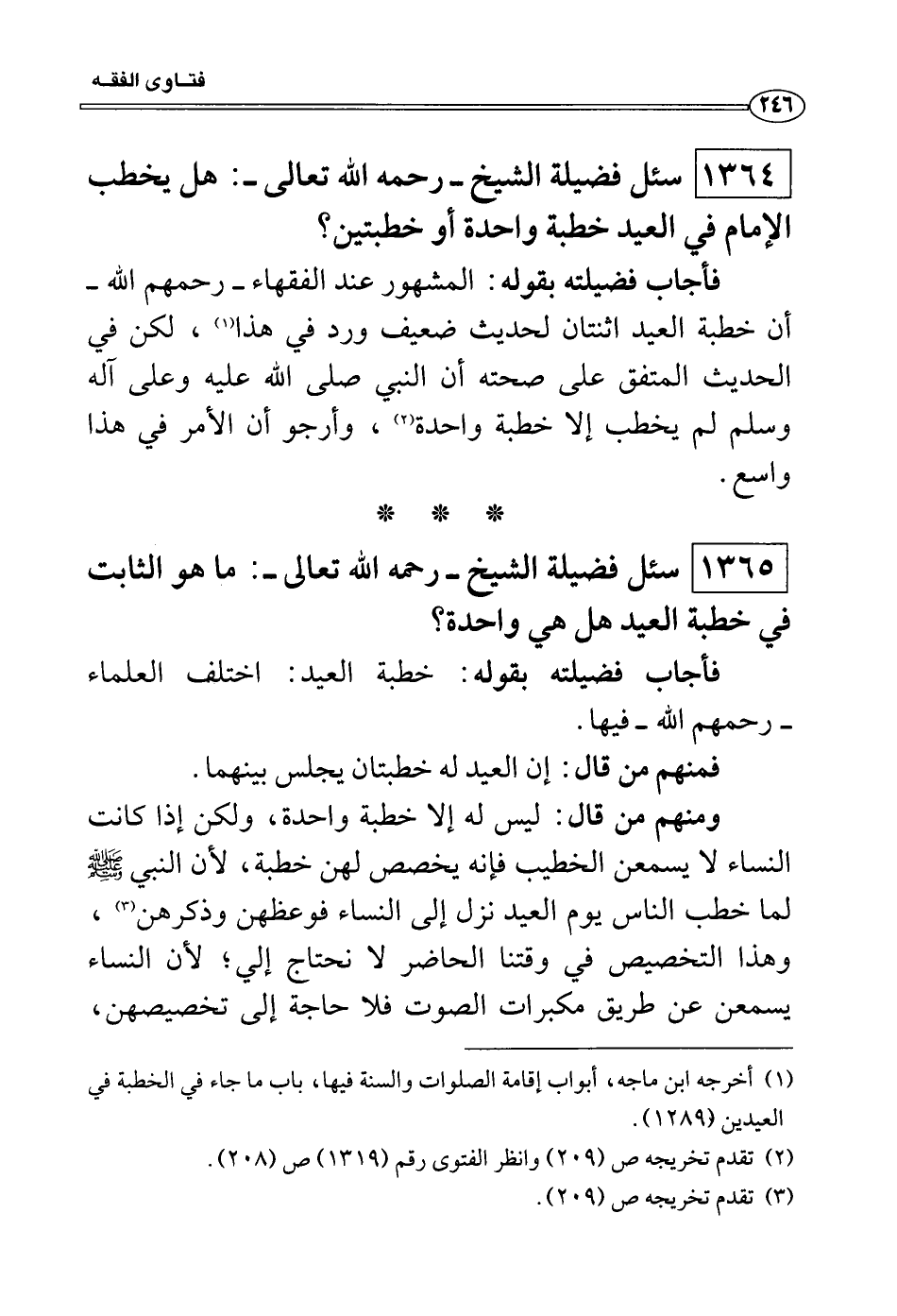 سئل فضيلة الشيخ - رحمه الله تعالى -: ما هو الثابت في خطبة العيد هل هي واحدة؟