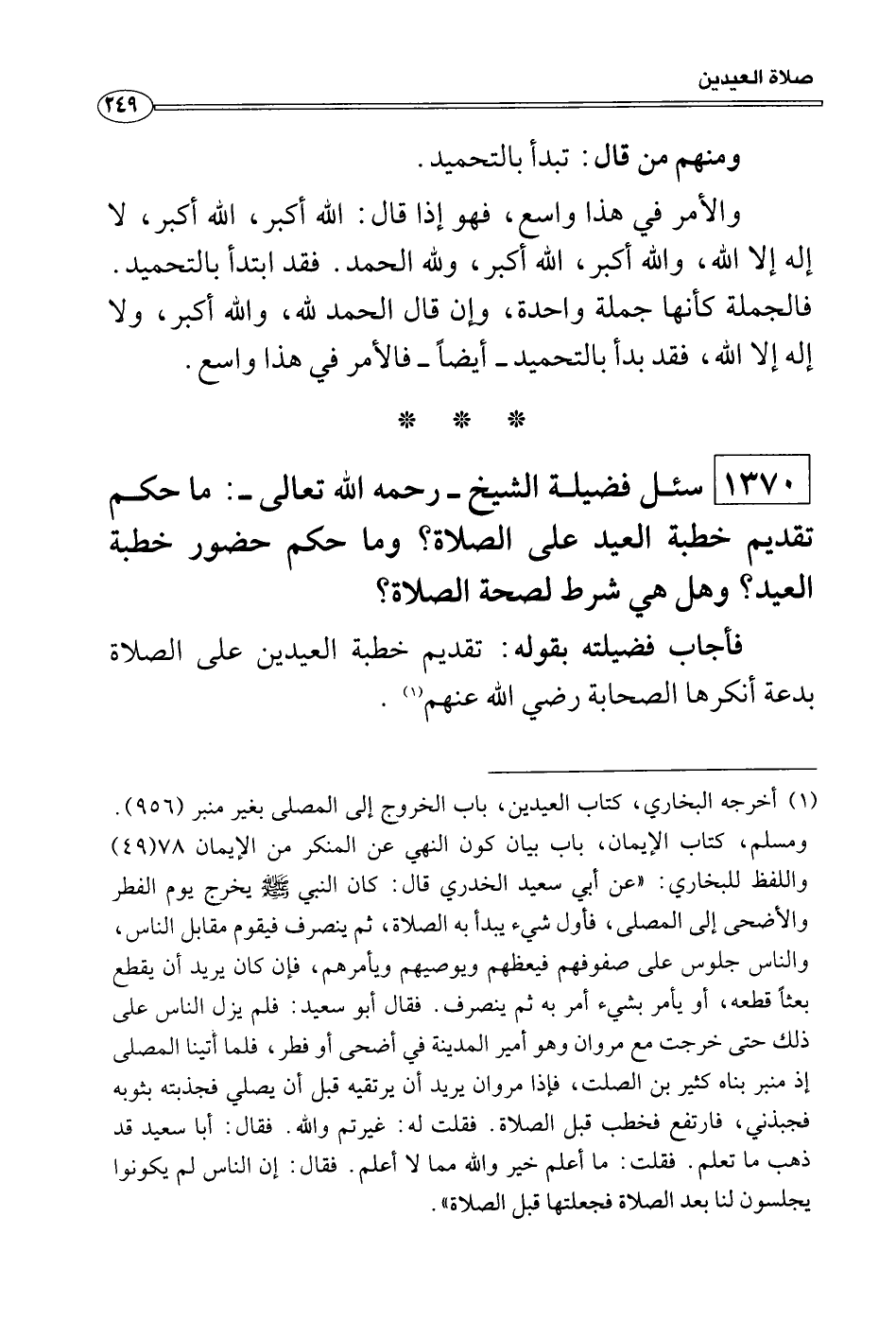 فأجاب فضيلته بقوله: تقديم خطبة العيدين على الصلاة بدعة أنكرها الصحابة رضي الله عنهم.