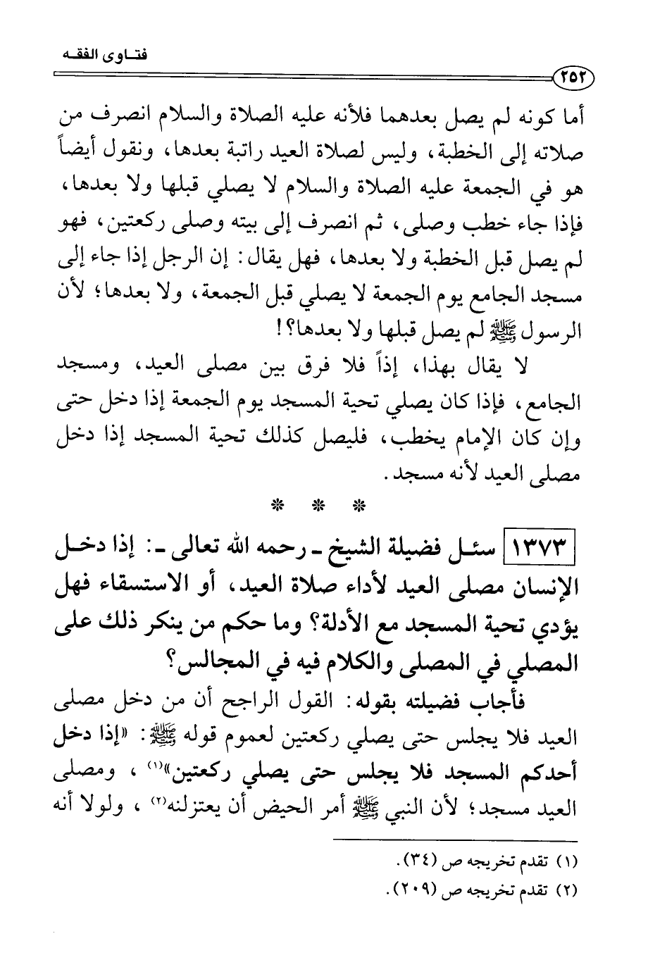 فأجاب فضيلته بقوله: القول الراجح أن من دخل مصلى العيد فلا يجلس حتى يصلي ركعتين لعموم قوله صَلَّى اللَّهُ عَلَيْهِ وَسَلَّمَ: «إذا دخل أحدكم المسجد فلا يجلس حتى يصلي ركعتين» ، ومصلى العيد مسجد؛ لأن النبي صَلَّى اللَّهُ عَلَيْهِ وَسَلَّمَ أمر الحيض أن يعتزلنه، ولولا أنه