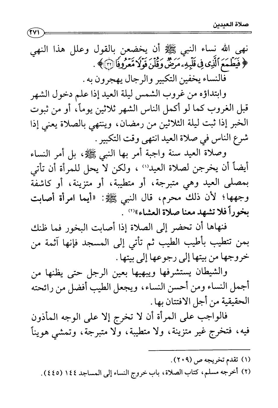 وصلاة العيد سنة واجبة أمر بها النبي صَلَّى اللَّهُ عَلَيْهِ وَسَلَّمَ، بل أمر النساء أيضاً أن يخرجن لصلاة العيد، ولكن لا يحل للمرأة أن تأتي بمصلى العيد وهي متبرجة، أو متطيبة، أو متزينة، أو كاشفة وجهها؛ لأن ذلك محرم، قال النبي صَلَّى اللَّهُ عَلَيْهِ وَسَلَّمَ: «أيما امرأة أصابت بخوراً فلا تشهد معنا صلاة العشاء» .