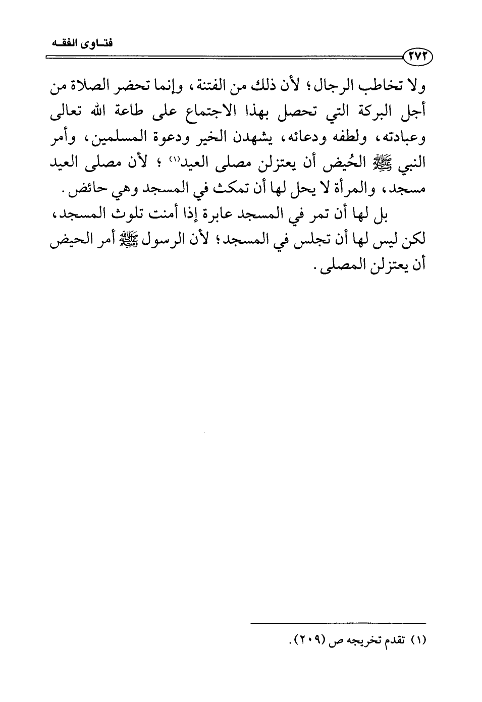 ولا تخاطب الرجال؛ لأن ذلك من الفتنة، وإنما تحضر الصلاة من أجل البركة التي تحصل بهذا الاجتماع على طاعة الله تعالى وعبادته، ولطفه ودعائه، يشهدن الخير ودعوة المسلمين، وأمر النبي صَلَّى اللَّهُ عَلَيْهِ وَسَلَّمَ الحُيض أن يعتزلن مصلى العيد؛ لأن مصلى العيد مسجد، والمرأة لا يحل لها أن تمكث في المسجد وهي حائض.