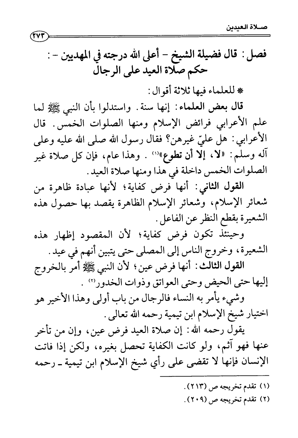 قال بعض العلماء: إنها سنة. واستدلوا بأن النبي صَلَّى اللَّهُ عَلَيْهِ وَسَلَّمَ لما علم الأعرابي فرائض الإسلام ومنها الصلوات الخمس. قال الأعرابي: هل عليّ غيرهن؟ فقال رسول الله صلى الله عليه وعلى آله وسلم: «لا، إلا أن تطوع» . وهذا عام، فإن كل صلاة غير الصلوات الخمس داخلة في هذا ومنها صلاة العيد.