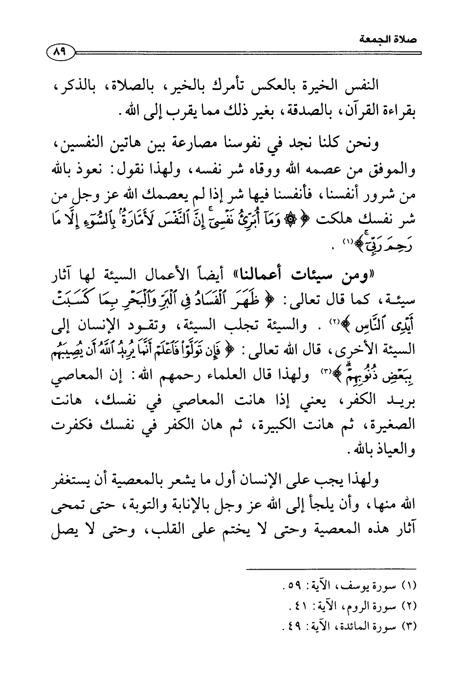 «ومن سيئات أعمالنا» أيضاً الأعمال السيئة لها آثار سيئة، كما قال تعالى: {ظَهَرَ الْفَسَادُ فِى الْبَرِّ وَالْبَحْرِ بِمَا كَسَبَتْ أَيْدِى النَّاسِ لِيُذِيقَهُمْ بَعْضَ الَّذِى عَمِلُواْ لَعَلَّهُمْ يَرْجِعُونَ} . والسيئة تجلب السيئة، وتقود الإنسان إلى السيئة الأخرى، قال الله تعالى: {فَإِن تَوَلَّوْاْ فَاعْلَمْ أَنَّمَا يُرِيدُ اللهُ أَن يُصِيبَهُم بِبَعْضِ ذُنُوبِهِمْ وَإِنَّ كَثِيراً مِّنَ النَّاسِ لَفَاسِقُونَ} ولهذا قال العلماء رحمهم الله: إن المعاصي بريد الكفر، يعني إذا هانت المعاصي في نفسك، هانت الصغيرة، ثم هانت الكبيرة، ثم هان الكفر في نفسك فكفرت والعياذ بالله.