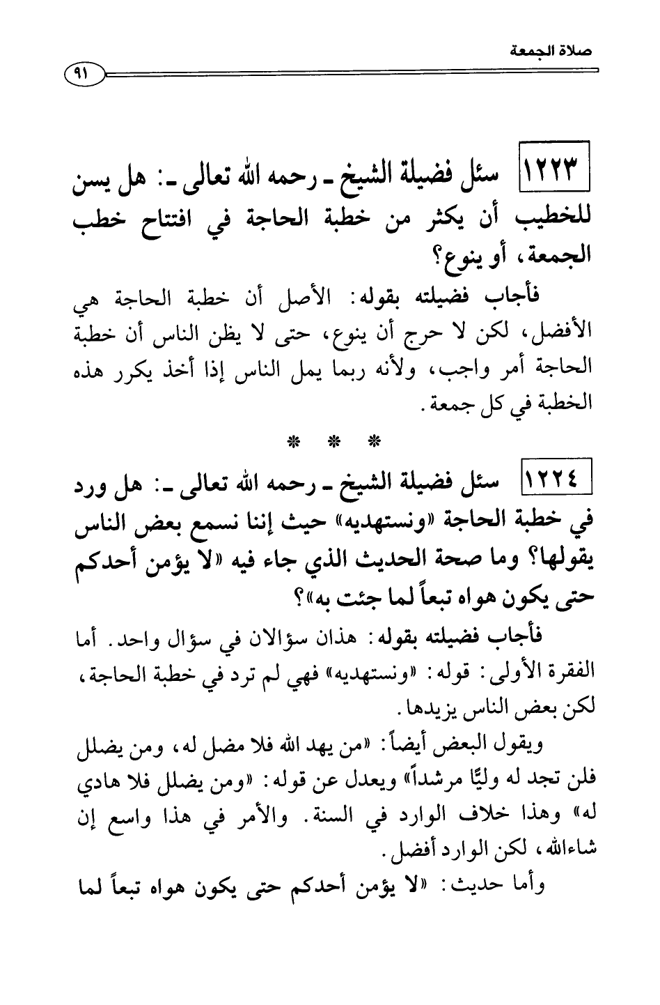 فأجاب فضيلته بقوله: الأصل أن خطبة الحاجة هي الأفضل، لكن لا حرج أن ينوع، حتى لا يظن الناس أن خطبة الحاجة أمر واجب، ولأنه ربما يمل الناس إذا أخذ يكرر هذه الخطبة في كل جمعة.
