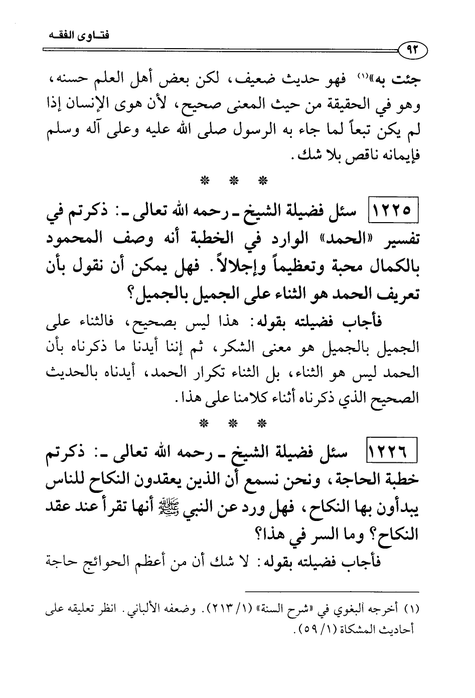 فأجاب فضيلته بقوله: هذا ليس بصحيح، فالثناء على الجميل بالجميل هو معنى الشكر، ثم إننا أيدنا ما ذكرناه بأن الحمد ليس هو الثناء، بل الثناء تكرار الحمد، أيدناه بالحديث الصحيح الذي ذكرناه أثناء كلامنا على هذا.