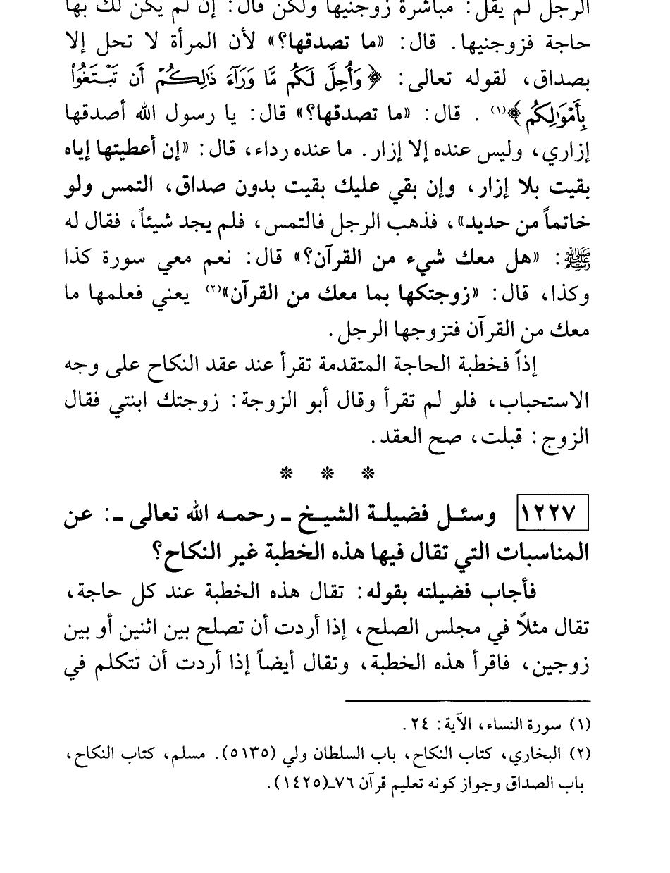 الرجل لم يقل: مباشرة زوجنيها ولكن قال: إن لم يكن لك بها حاجة فزوجنيها. قال: «ما تصدقها؟» لأن المرأة لا تحل إلا بصداق، لقوله تعالى: {وَأُحِلَّ لَكُمْ مَّا وَرَاءَ ذَلِكُمْ أَن تَبْتَغُواْ بِأَمْوَالِكُمْ مُّحْصِنِينَ غَيْرَ مُسَافِحِينَ فَمَا اسْتَمْتَعْتُمْ بِهِ مِنْهُنَّ فَئَاتُوهُنَّ أُجُورَهُنَّ فَرِيضَةً وَلاَ جُنَاحَ عَلَيْكُمْ فِيمَا تَرَاضَيْتُمْ بِهِ مِن بَعْدِ الْفَرِيضَةِ إِنَّ اللهَ كَانَ عَلِيماً حَكِيماً} . قال: «ما تصدقها؟» قال: يا رسول الله أصدقها إزاري، وليس عنده إلا إزار. ما عنده رداء، قال: «إن أعطيتها إياه بقيت بلا إزار، وإن بقي عليك بقيت بدون صداق، التمس ولو خاتماً من حديد» ، فذهب الرجل فالتمس، فلم يجد شيئاً، فقال له صَلَّى اللَّهُ عَلَيْهِ وَسَلَّمَ: «هل معك شيء من القرآن؟» قال: نعم معي سورة كذا وكذا، قال: «زوجتكها بما معك من القرآن» يعني فعلمها ما معك من القرآن فتزوجها الرجل.