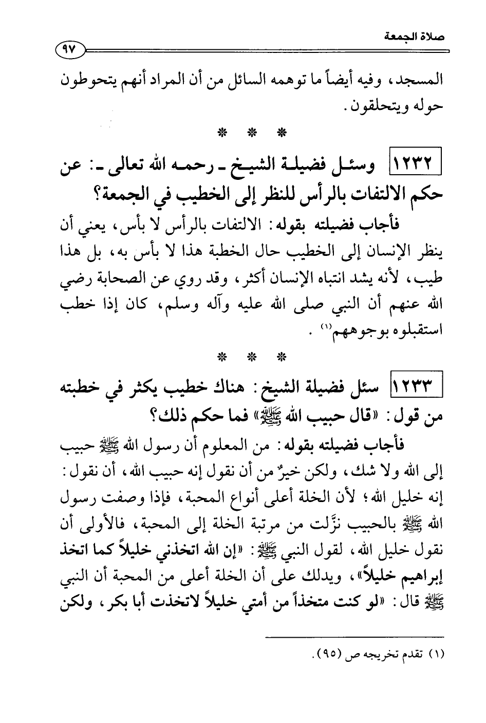 وسئل فضيلة الشيخ - رحمه الله تعالى -: عن حكم الالتفات بالرأس للنظر إلى الخطيب في الجمعة؟
