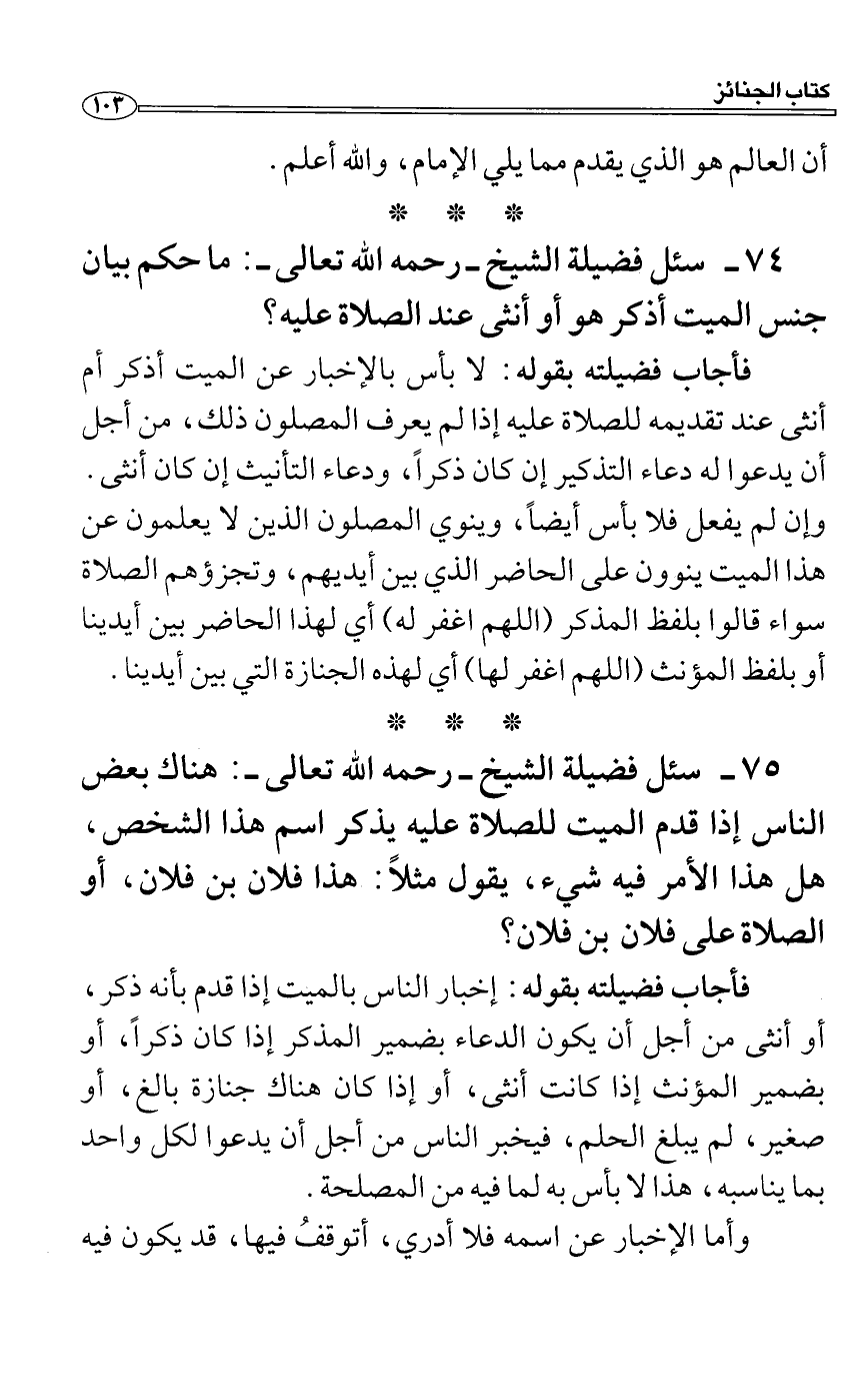 سئل فضيلة الشيخ رحمه الله تعالى: ما حكم بيان جنس الميت أذكر هو أو أنثى عند الصلاة عليه؟