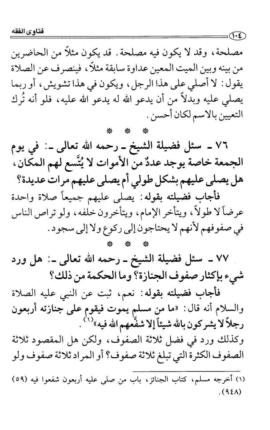 سئل فضيلة الشيخ رحمه الله تعالى: هل ورد شيء بإكثار صفوف الجنازة؟ وما الحكمة من ذلك؟