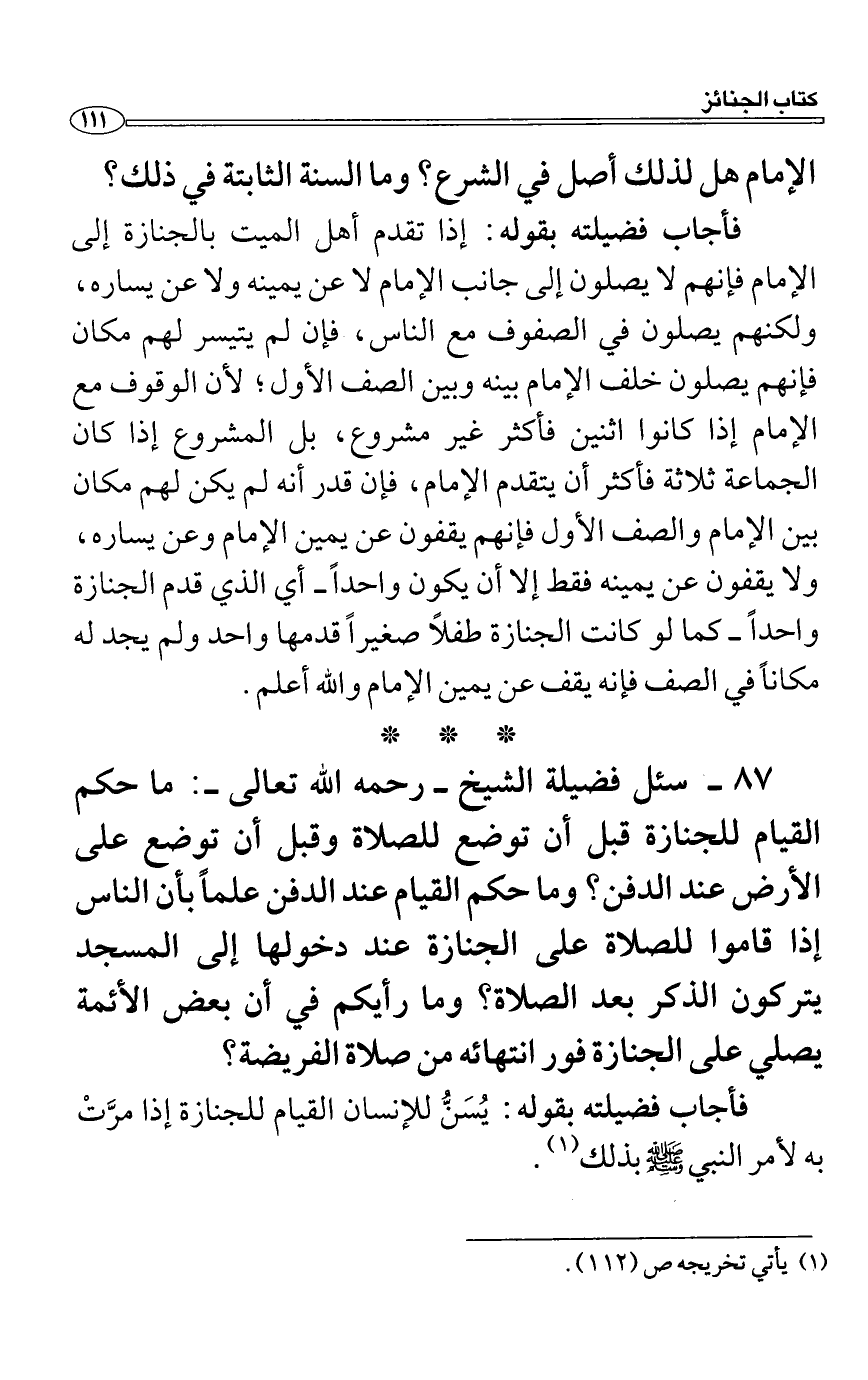 فأجاب فضيلته بقوله: إذا تقدم أهل الميت بالجنازة إلى الإمام فإنهم لا يصلون إلى جانب الإمام لا عن يمينه ولا عن يساره، ولكنهم يصلون في الصفوف مع الناس، فإن لم يتيسر لهم مكان فإنهم يصلون خلف الإمام بينه وبين الصف الأول؛ لأن الوقوف مع الإمام إذا كانوا اثنين فأكثر غير مشروع، بل المشروع إذا كان الجماعة ثلاثة فأكثر أن يتقدم الإمام، فإن قدر أنه لم يكن لهم مكان بين الإمام والصف الأول فإنهم يقفون عن يمين الإمام وعن يساره، ولا يقفون عن يمينه فقط إلا أن يكون واحداً أي الذي قدم الجنازة واحداً كما لو كانت الجنازة طفلاً صغيراً قدمها واحد ولم يجد له مكاناً في الصف فإنه يقف عن يمين الإمام والله أعلم.
