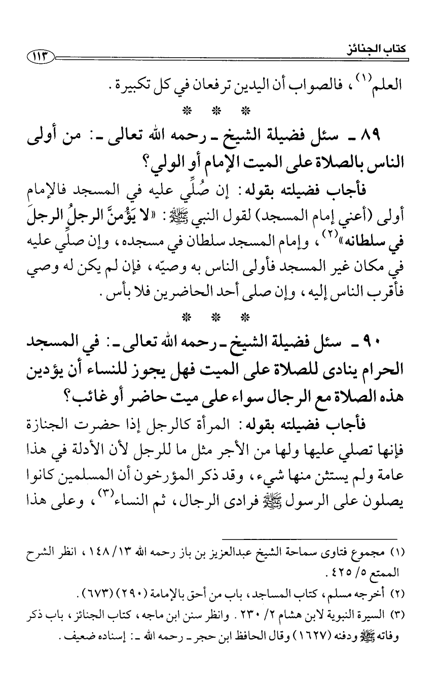 فأجاب فضيلته بقوله: إن صُلِّي عليه في المسجد فالإمام أولى (أعني إمام المسجد) لقول النبي صَلَّى اللَّهُ عَلَيْهِ وَسَلَّمَ: "لا يَؤُمنَّ الرجلُ الرجلَ في سلطانه"، وإمام المسجد سلطان في مسجده، وإن صلِّي عليه في مكان غير المسجد فأولى الناس به وصيّه، فإن لم يكن له وصي فأقرب الناس إليه، وإن صلى أحد الحاضرين فلا بأس.