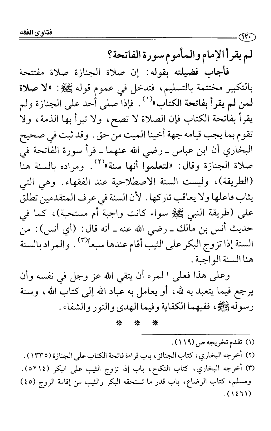 فأجاب فضيلته بقوله: إن صلاة الجنازة صلاة مفتتحة بالتكبير مختتمة بالتسليم، فتدخل في عموم قوله صَلَّى اللَّهُ عَلَيْهِ وَسَلَّمَ: "لا صلاة لمن لم يقرأ بفاتحة الكتاب". فإذا صلى أحد على الجنازة ولم يقرأ بفاتحة الكتاب فإن الصلاة لا تصح، ولا تبرأ بها الذمة، ولا تقوم بما يجب قيامه جهة أخينا الميت من حق. وقد ثبت في صحيح البخاري أن ابن عباس رضي الله عنهما قرأ سورة الفاتحة في صلاة الجنازة وقال: "لتعلموا أنها سنة". ومراده بالسنة هنا (الطريقة) ، وليست السنة الاصطلاحية عند الفقهاء. وهي التي يثاب فاعلها ولا يعاقب تاركها. لأن السنة في عرف المتقدمين تطلق على (طريقة النبي صَلَّى اللَّهُ عَلَيْهِ وَسَلَّمَ سواء كانت واجبة أم مستحبة) ، كما في حديث أنس بن مالك رضي الله عنه أنه قال: (أي أنس) : من السنة إذا تزوج البكر على الثيب أقام عندها سبعاً. والمراد بالسنة هنا السنة الواجبة.