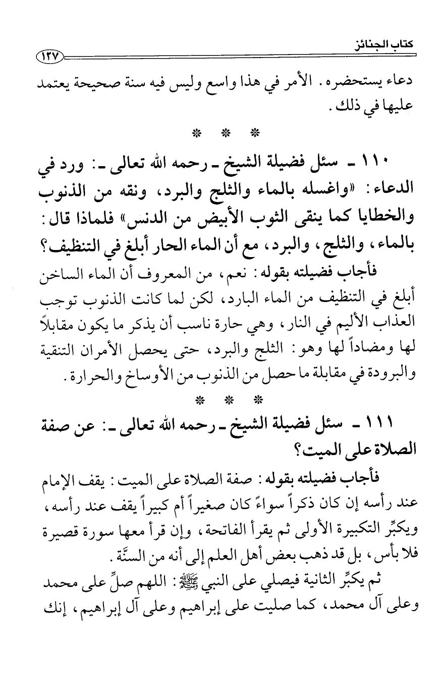 سئل فضيلة الشيخ رحمه الله تعالى: ورد في الدعاء: "واغسله بالماء والثلج والبرد، ونقه من الذنوب والخطايا كما ينقى الثوب الأبيض من الدنس" فلماذا قال: بالماء، والثلج، والبرد، مع أن الماء الحار أبلغ في التنظيف؟