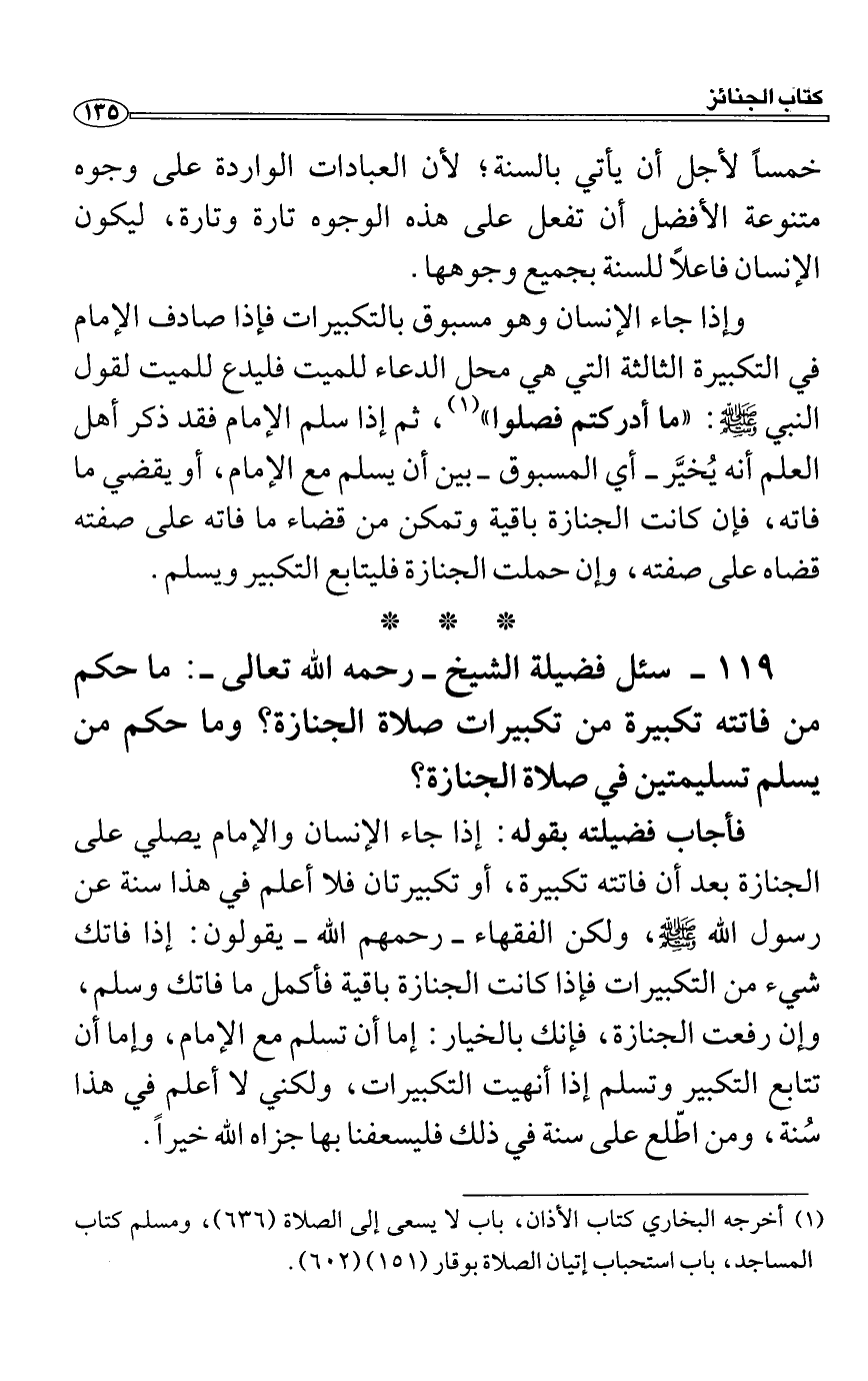 فأجاب فضيلته بقوله: إذا جاء الإنسان والإمام يصلي على الجنازة بعد أن فاتته تكبيرة، أو تكبيرتان فلا أعلم في هذا سنة عن رسول الله صَلَّى اللَّهُ عَلَيْهِ وَسَلَّمَ، ولكن الفقهاء رحمهم الله يقولون: إذا فاتك شيء من التكبيرات فإذا كانت الجنازة باقية فأكمل ما فاتك وسلم، وإن رفعت الجنازة، فإنك بالخيار: إما أن تسلم مع الإمام، وإما أن تتابع التكبير وتسلم إذا أنهيت التكبيرات، ولكني لا أعلم في هذا سُنة، ومن اطّلع على سنة في ذلك فليسعفنا بها جزاه الله خيراً.