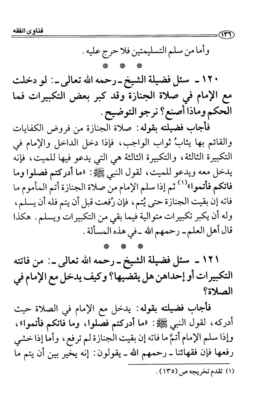 فأجاب فضيلته بقوله: يدخل مع الإمام في الصلاة حيث أدركه، لقول النبي صَلَّى اللَّهُ عَلَيْهِ وَسَلَّمَ: "ما أدركتم فصلوا، وما فاتكم فأتموا"، وإذا سلم الإمام أتمَّ ما فاته إن بقيت الجنازة لم ترفع، وأما إذا خشي رفعها فإن فقهائنا رحمهم الله يقولون: إنه يخير بين أن يتم ما