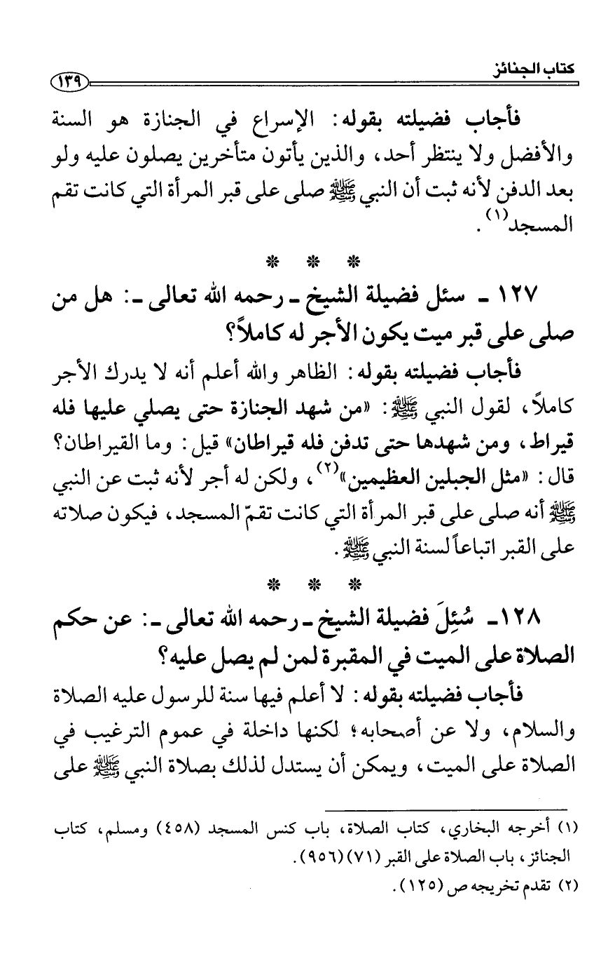 سئل فضيلة الشيخ رحمه الله تعالى: هل من صلى على قبر ميت يكون الأجر له كاملاً؟