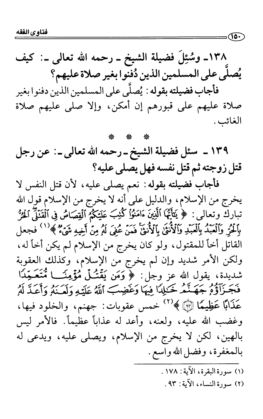 فأجاب فضيلته بقوله: نعم يصلى عليه، لأن قتل النفس لا يخرج من الإسلام، والدليل على أنه لا يخرج من الإسلام قول الله تبارك وتعالى: {ياأَيُّهَا الَّذِينَءَامَنُواْ كُتِبَ عَلَيْكُمُ الْقِصَاصُ فِي الْقَتْلَى الْحُرُّ بِالْحُرِّ وَالْعَبْدُ بِالْعَبْدِ وَالاُْنثَى بِالاُْنْثَى فَمَنْ عُفِىَ لَهُ مِنْ أَخِيهِ شَىْءٌ فَاتِّبَاعٌ بِالْمَعْرُوفِ وَأَدَآءٌ إِلَيْهِ بِإِحْسَانٍ ذَالِكَ تَخْفِيفٌ مِّن رَّبِّكُمْ وَرَحْمَةٌ فَمَنِ اعْتَدَى بَعْدَ ذَالِكَ فَلَهُ عَذَابٌ أَلِيمٌ} فجعل القاتل أخاً للمقتول، ولو كان يخرج من الإسلام لم يكن أخاً له، ولكن الأمر شديد وإن لم يخرج من الإسلام، وكذلك العقوبة شديدة، يقول الله عز وجل: {وَمَن يَقْتُلْ مُؤْمِناً مُّتَعَمِّداً فَجَزَآؤُهُ جَهَنَّمُ خَالِداً فِيهَا وَغَضِبَ اللهُ عَلَيْهِ وَلَعَنَهُ وَأَعَدَّ لَهُ عَذَاباً عَظِيماً} خمس عقوبات: جهنم، والخلود فيها، وغضب الله عليه، ولعنه، وأعد له عذاباً عظيماً. فالأمر ليس بالهين، لكن لا يخرج من الإسلام، ويصلى عليه، ويدعى له بالمغفرة، وفضل الله واسع.
