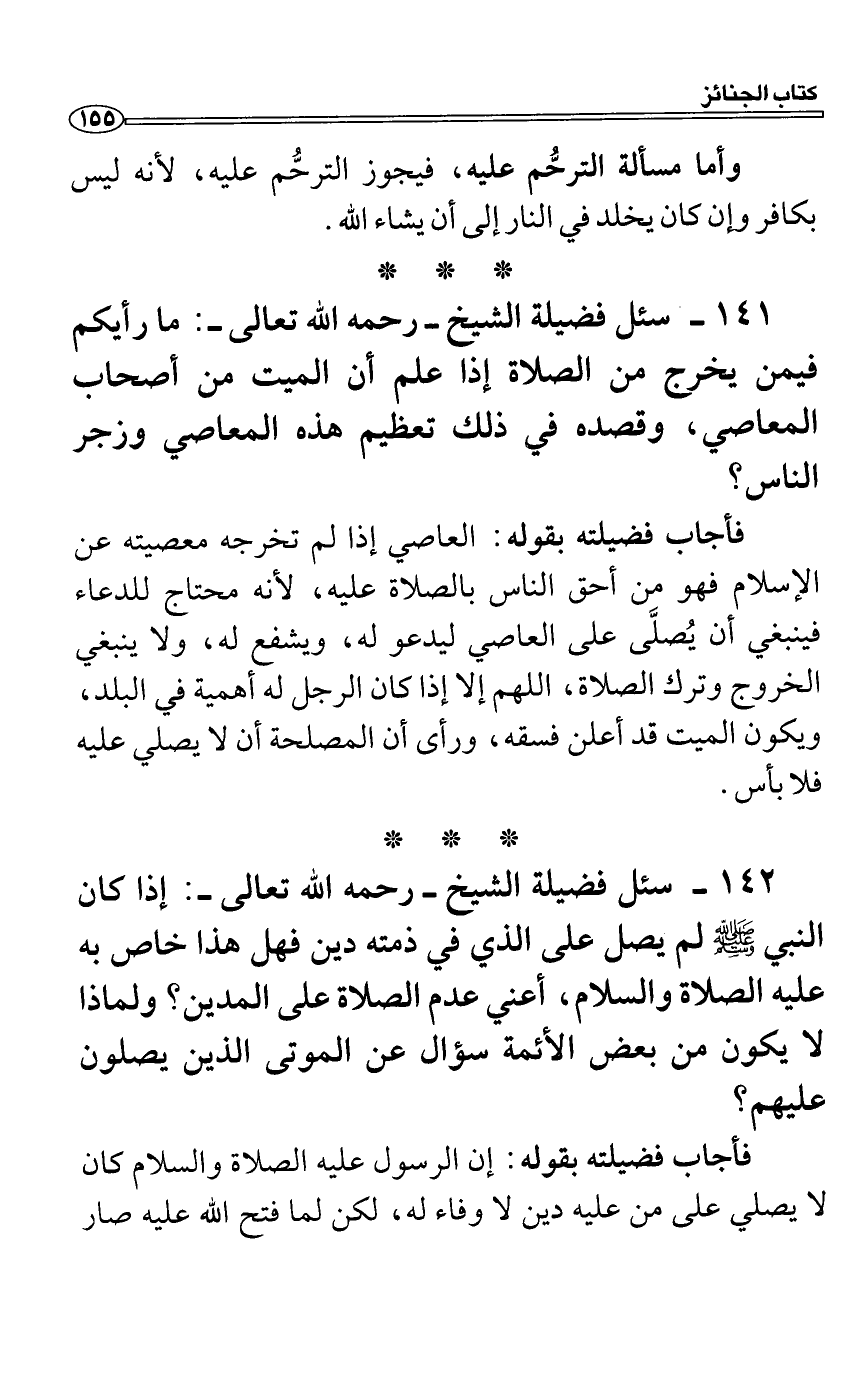سئل فضيلة الشيخ رحمه الله تعالى: ما رأيكم فيمن يخرج من الصلاة إذا علم أن الميت من أصحاب المعاصي، وقصده في ذلك تعظيم هذه المعاصي وزجر الناس؟