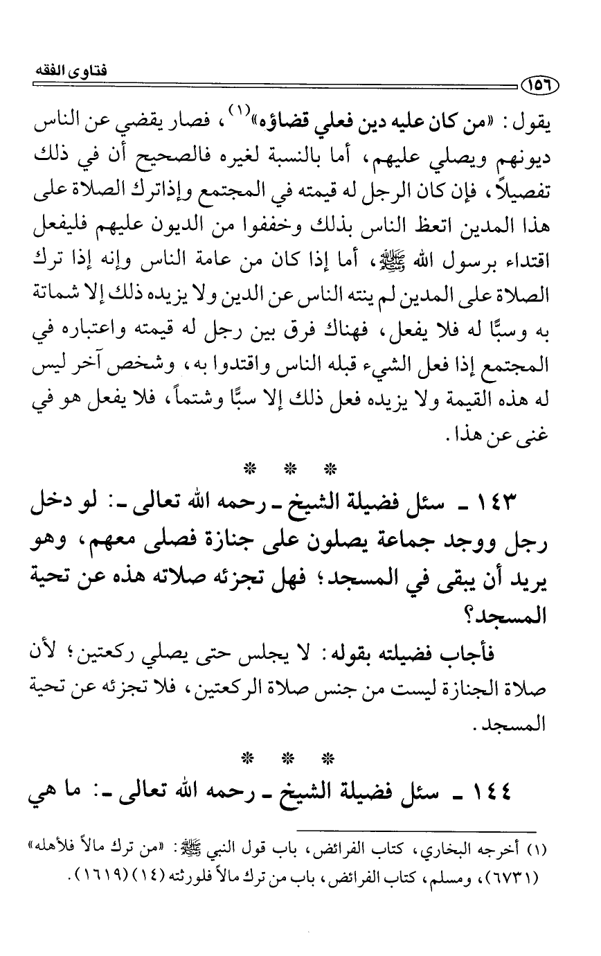 يقول: "من كان عليه دين فعلي قضاؤه"، فصار يقضي عن الناس ديونهم ويصلي عليهم، أما بالنسبة لغيره فالصحيح أن في ذلك تفصيلاً، فإن كان الرجل له قيمته في المجتمع وإذاترك الصلاة على هذا المدين اتعظ الناس بذلك وخففوا من الديون عليهم فليفعل اقتداء برسول الله صَلَّى اللَّهُ عَلَيْهِ وَسَلَّمَ، أما إذا كان من عامة الناس وإنه إذا ترك الصلاة على المدين لم ينته الناس عن الدين ولا يزيده ذلك إلا شماتة به وسبًّا له فلا يفعل، فهناك فرق بين رجل له قيمته واعتباره في المجتمع إذا فعل الشيء قبله الناس واقتدوا به، وشخص آخر ليس له هذه القيمة ولا يزيده فعل ذلك إلا سبًّا وشتماً، فلا يفعل هو في غنى عن هذا.