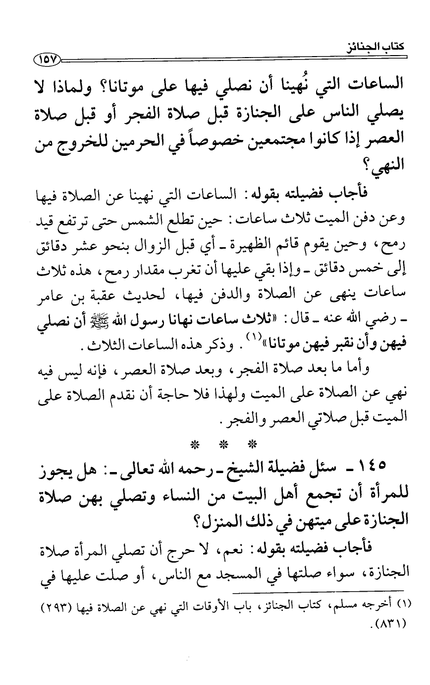 فأجاب فضيلته بقوله: الساعات التي نهينا عن الصلاة فيها وعن دفن الميت ثلاث ساعات: حين تطلع الشمس حتى ترتفع قيد رمح، وحين يقوم قائم الظهيرة أي قبل الزوال بنحو عشر دقائق إلى خمس دقائق وإذا بقي عليها أن تغرب مقدار رمح، هذه ثلاث ساعات ينهى عن الصلاة والدفن فيها، لحديث عقبة بن عامر رضي الله عنه قال: "ثلاث ساعات نهانا رسول الله صَلَّى اللَّهُ عَلَيْهِ وَسَلَّمَ أن نصلي فيهن وأن نقبر فيهن موتانا". وذكر هذه الساعات الثلاث.