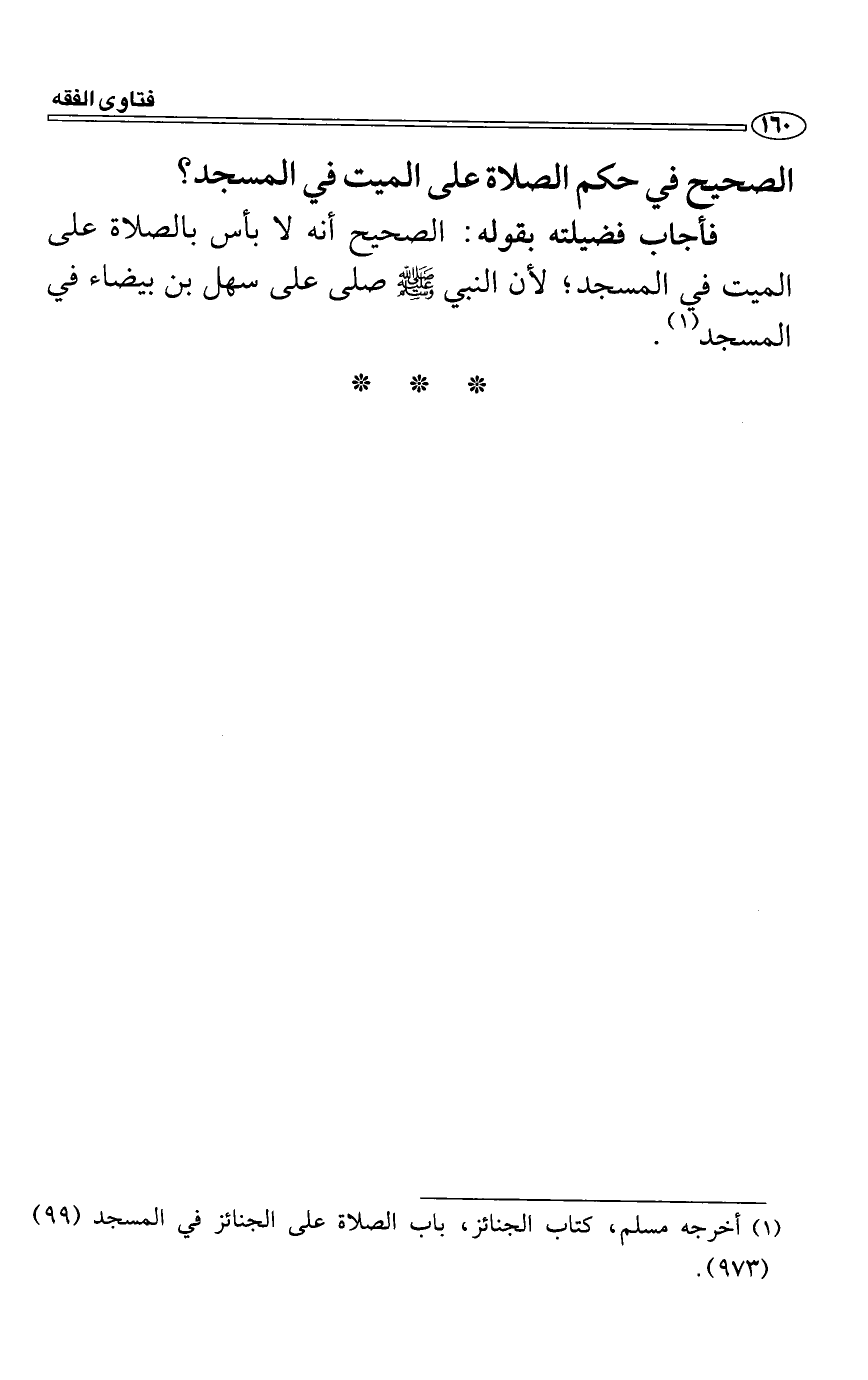 فأجاب فضيلته بقوله: الصحيح أنه لا بأس بالصلاة على الميت في المسجد؛ لأن النبي صَلَّى اللَّهُ عَلَيْهِ وَسَلَّمَ صلى على سهل بن بيضاء في المسجد.