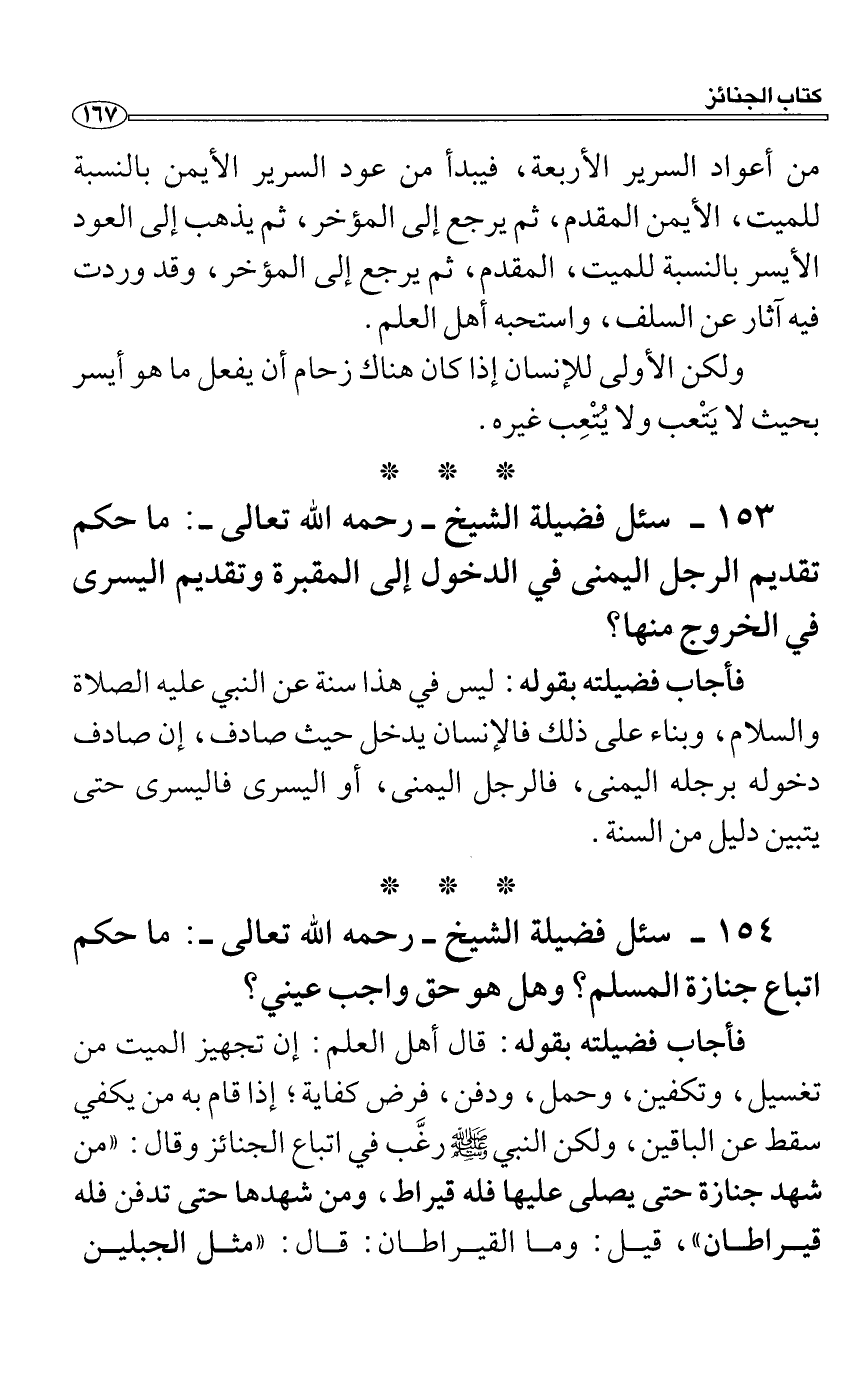 سئل فضيلة الشيخ رحمه الله تعالى: ما حكم تقديم الرجل اليمنى في الدخول إلى المقبرة وتقديم اليسرى في الخروج منها؟