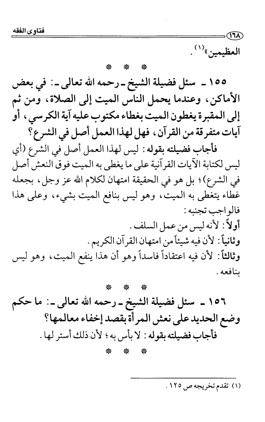 فأجاب فضيلته بقوله: ليس لهذا العمل أصل في الشرع (أي ليس لكتابة الآيات القرآنية على ما يغطى به الميت فوق النعش أصل في الشرع) ؛ بل هو في الحقيقة امتهان لكلام الله عز وجل، بجعله غطاء يتغطى به الميت، وهو ليس بنافع الميت بشيء، وعلى هذا فالواجب تجنبه: