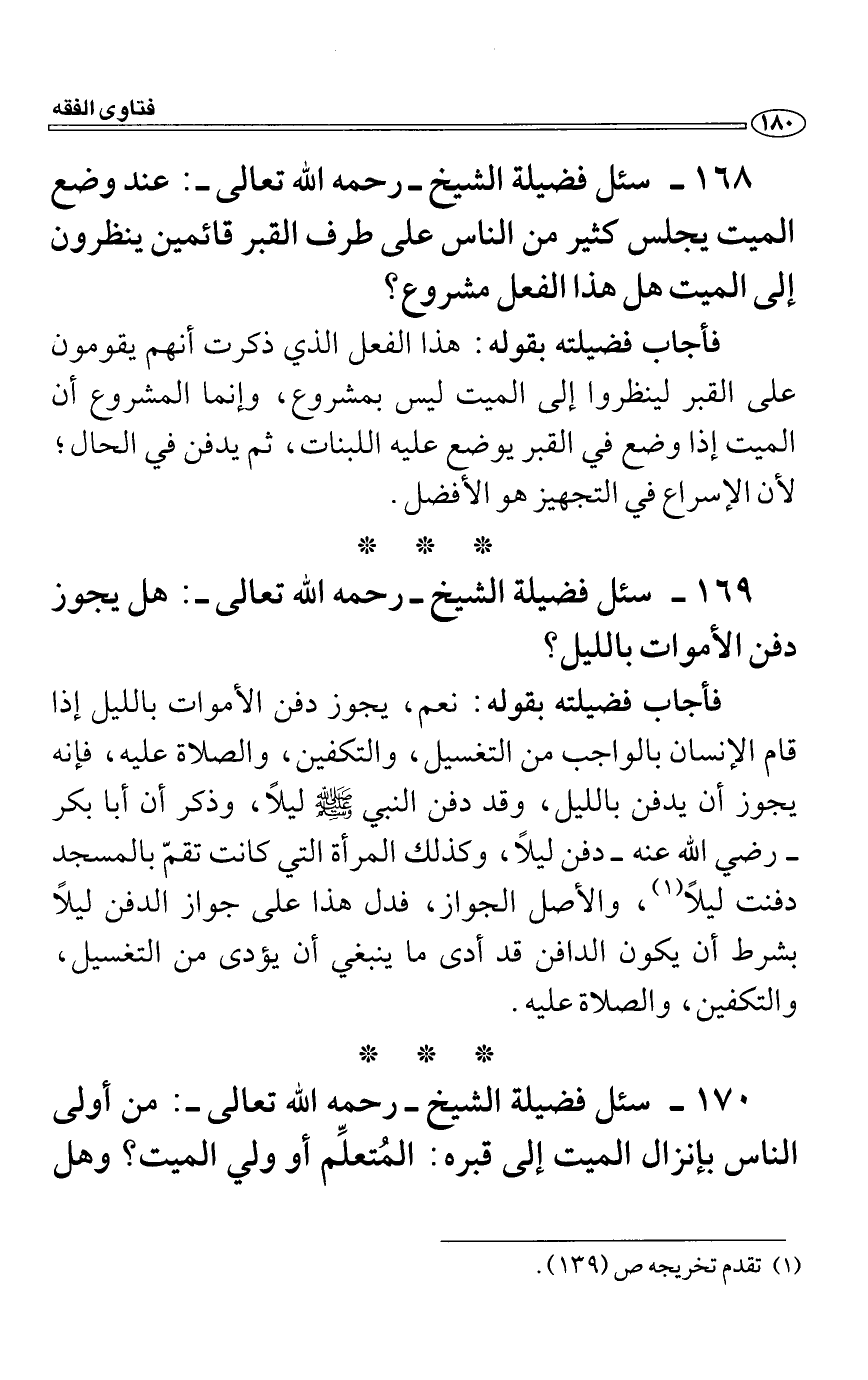 فأجاب فضيلته بقوله: هذا الفعل الذي ذكرت أنهم يقومون على القبر لينظروا إلى الميت ليس بمشروع، وإنما المشروع أن الميت إذا وضع في القبر يوضع عليه اللبنات، ثم يدفن في الحال؛ لأن الإسراع في التجهيز هو الأفضل.