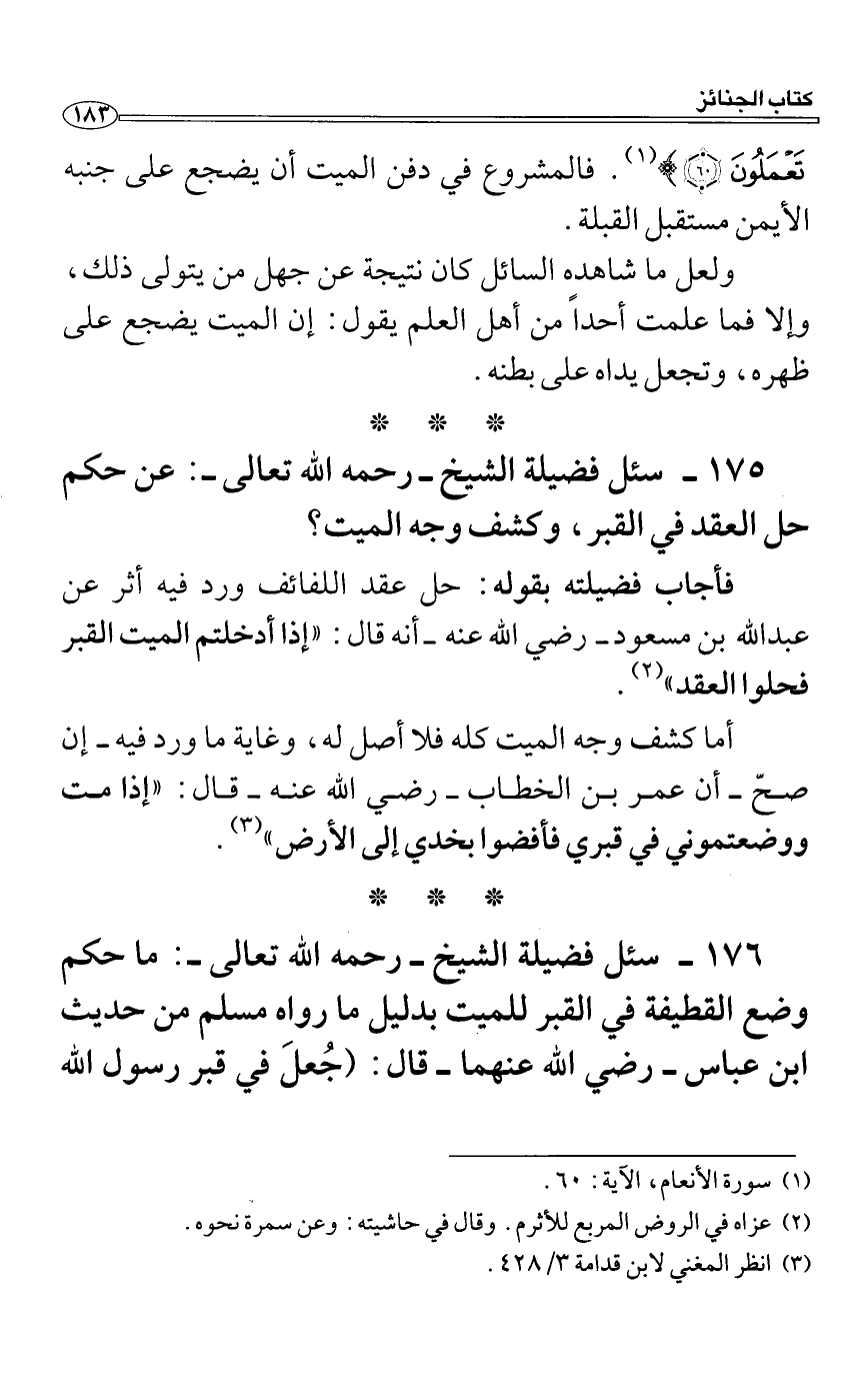 سئل فضيلة الشيخ رحمه الله تعالى: عن حكم حل العقد في القبر، وكشف وجه الميت؟
