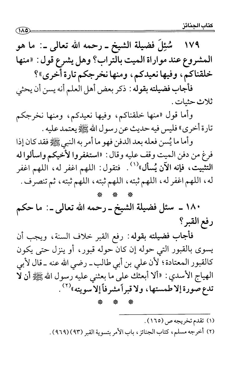فأجاب فضيلته بقوله: رفع القبر خلاف السنة، ويجب أن يسوى بالقبور التي حوله إن كان حوله قبور، أو ينزل حتى يكون كالقبور المعتادة؛ لأن علي بن أبي طالب رضي الله عنه قال لأبي الهياج الأسدي: "ألا أبعثك على ما بعثني عليه رسول الله صَلَّى اللَّهُ عَلَيْهِ وَسَلَّمَ أن لا تدع صورة إلا طمستها، ولا قبراً مشرفاً إلا سويته".